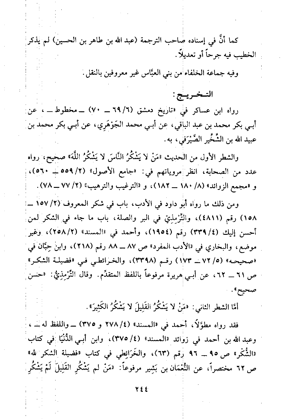 ومن ذلك ما رواه أبو داود في الأدب، باب في شكر المعروف (٢/ ١٥٧ - ١٥٨) رقم (٤٨١١)، والتِّرْمِذِيّ في البَرِّ والصلة، باب ما جاء في الشكر لمن أحسن إليك (٤/ ٣٣٩) رقم (١٩٥٤)، وأحمد في "المسند" (٢/ ٢٥٨)، وغير موضع، والبخاري في "الأدب المفرد" ص ٨٧ - ٨٨ رقم (٢١٨)، وابن حِبَّان في "صحيحه" (٥/ ٧٢ - ١٧٣) رقم (٣٣٩٨)، والخرائطي في "فضيلة الشكر" ص ٦١ - ٦٢، عن أبي هريرة مرفوعًا باللفظ المتقدِّم. وقال التِّرْمِذِيُّ: "حسن صحيح".
