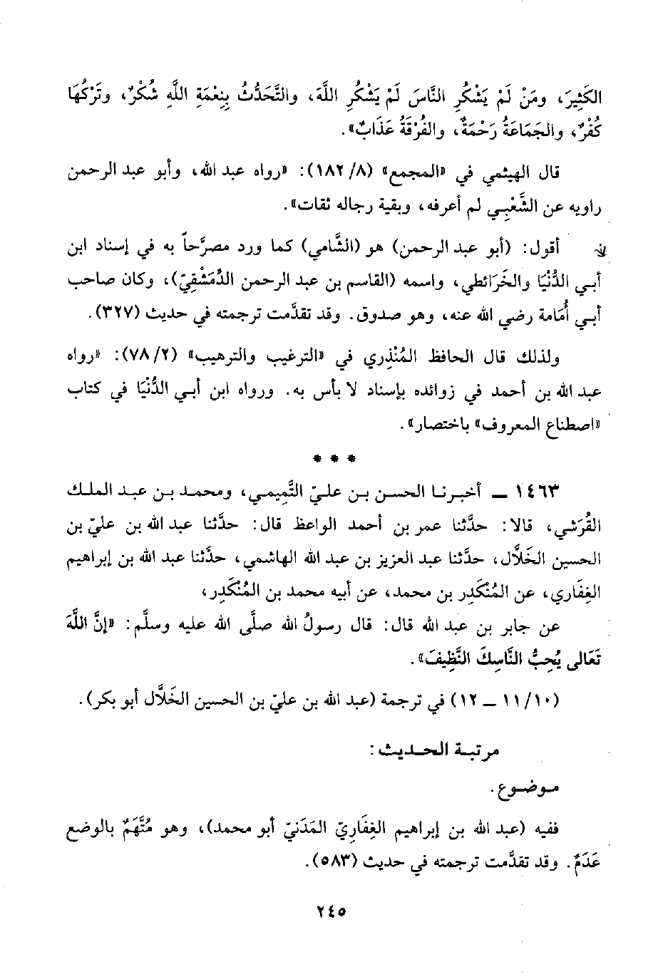 ١٤٦٣ - أخبرنا الحسن بن عليّ التَّمِيمي، ومحمد بن عبد الملك القُرَشي، قالا: حدَّثنا عمر بن أحمد الواعظ قال: حدَّثنا عبد اللَّه بن عليّ بن الحسين الخَلَّال، حدَّثنا عبد العزيز بن عبد اللَّه الهاشمي، حدَّثنا عبد اللَّه بن إبراهيم الغِفَاري، عن المُنْكَدِر بن محمد، عن أبيه محمد بن المُنْكَدِر،