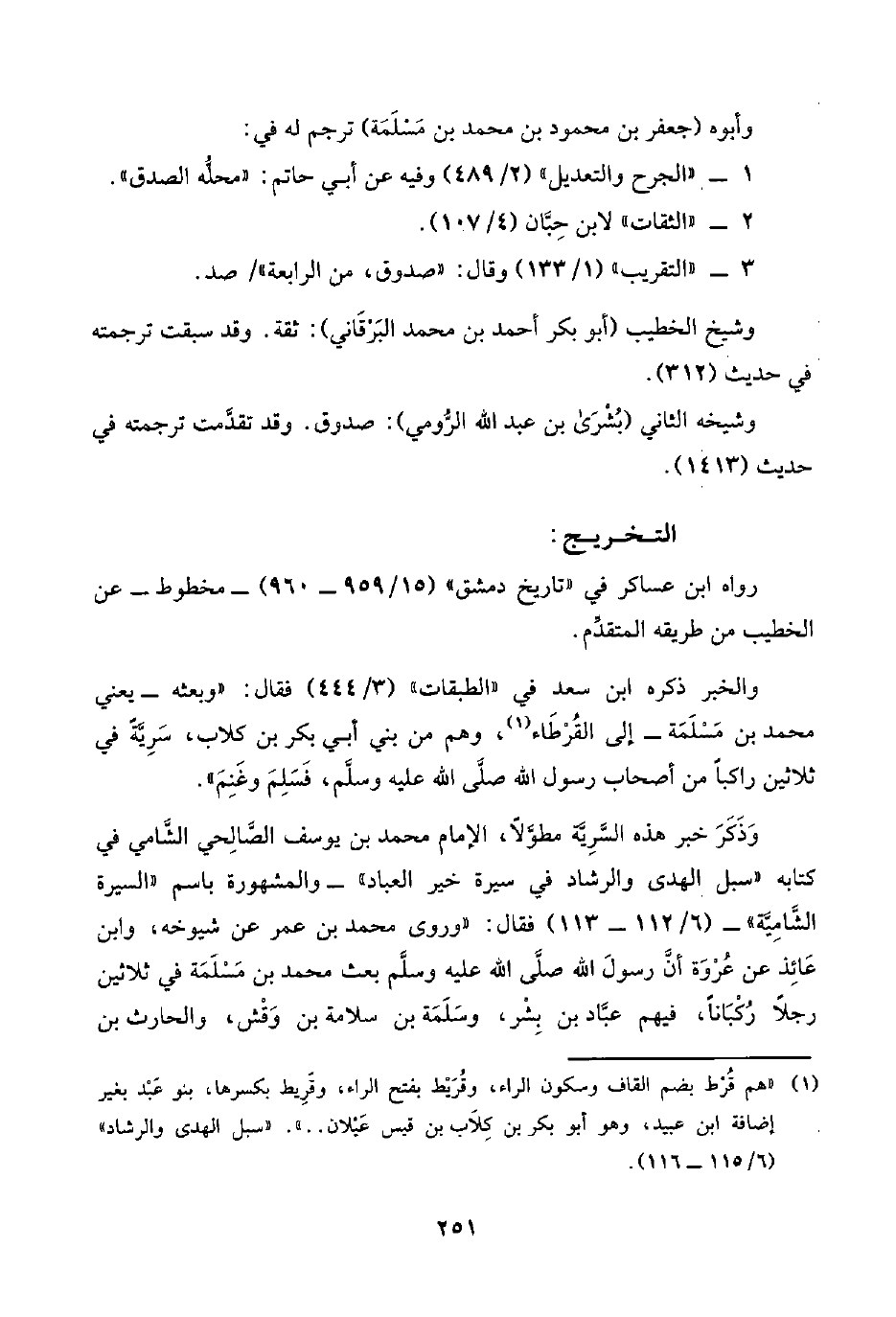 وَذَكَرَ خبر هذه السَّرِيَّة مطوَّلًا, الإمام محمد بن يوسف الصَّالِحي الشَّامي في كتابه "سبل الهدى والرشاد في سيرة خير العباد" -المشهورة باسم "السيرة الشَّامِيَّة"- (٦/ ١١٢ - ١١٣) فقال: "وروى محمد بن عمر عن شيوخه، وابن عَائِذ عن عُرْوَة أنَّ رسول اللَّه صلَّى اللَّه عليه وسلَّم بعث محمد بن مَسْلَمَة في ثلاثين رجلًا رُكْبَانًا، فيهم عبَّاد بن بِشْر، وسَلَمَة بن سلامة بن وَقْش، والحارث بن