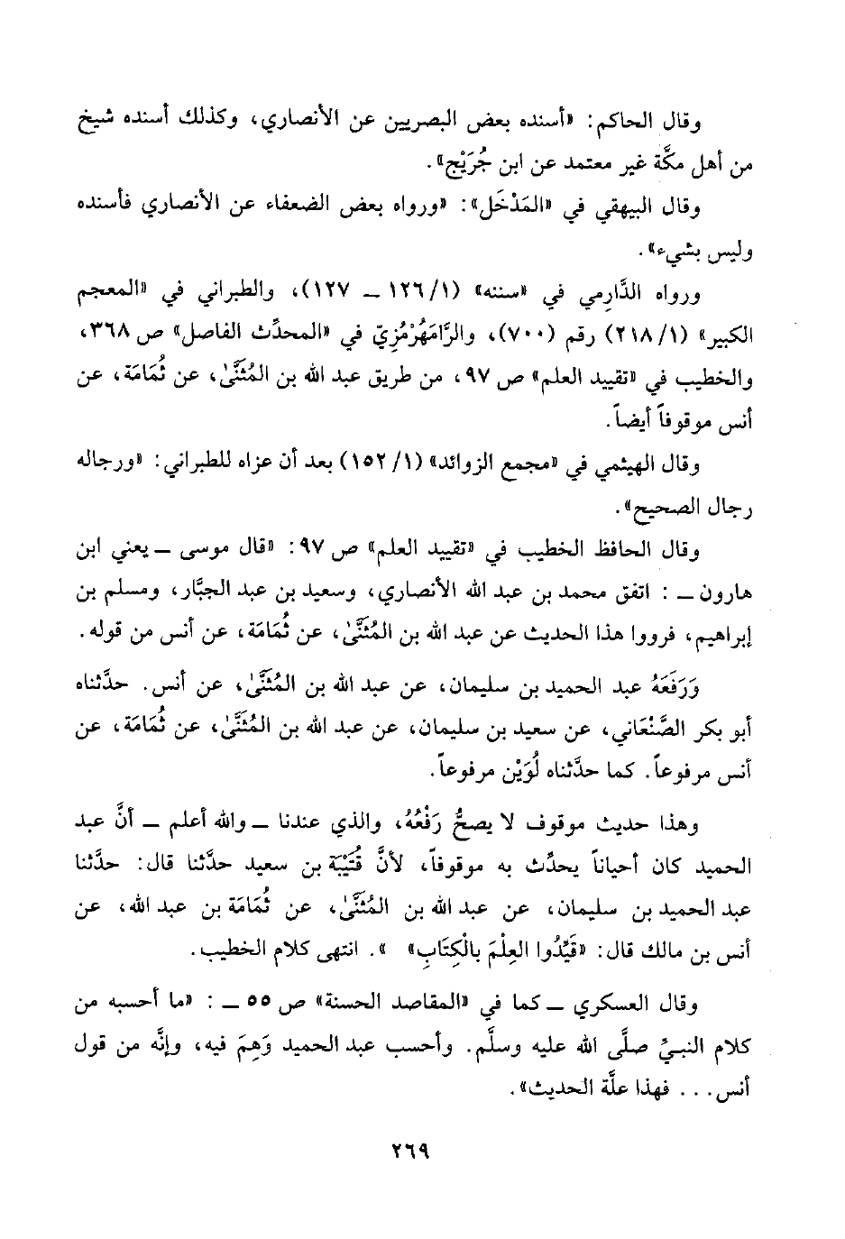 ورواه الدَّارمي في "سننه" (١/ ١٢٦ - ١٢٧)، والطبراني في "المعجم الكبير" (١/ ٢١٨) رقم (٧٠٠)، والرَّامَهُرْمُزِيّ في "المحدِّث الفاصل" ص ٣٦٨، والخطيب في "تقييد العلم" ص ٩٧، من طريق عبد اللَّه بن المُثَنَّى، عن ثُمَامَة، عن أنس موقوفًا أيضًا.