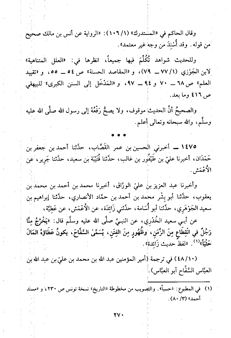 ١٤٧٥ - أخبرني الحسين بن عمر القَصَّاب، حدَّثنا أحمد بن جعفر بن حَمْدَان، أخبرنا عليّ بن طَيْفُور بن غالب، حدَّثنا قُتَيْبَة بن سعيد، حدَّثنا جَرِير، عن الأَعْمَش.