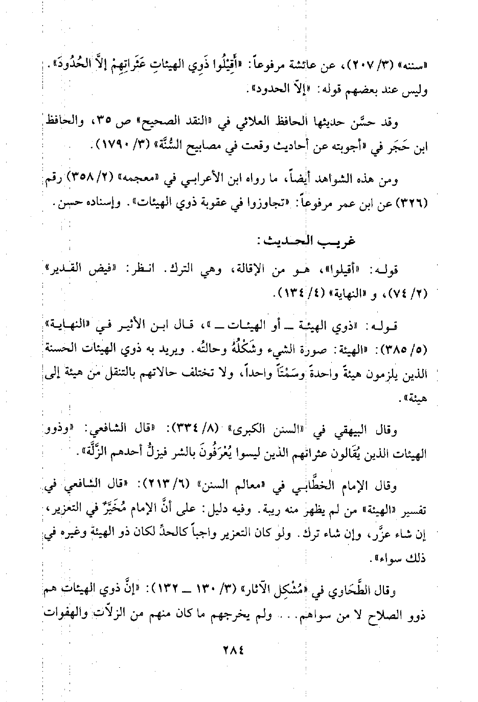 وقال البيهقي في "السنن الكبرى" (٨/ ٣٣٤): "قال الشافعي: "وذوو الهيئات الذين يُقَالون عثراتهم الذين ليسوا يُعْرَفُونَ بالشر فيزلُّ أحدهم الزَّلَّة".