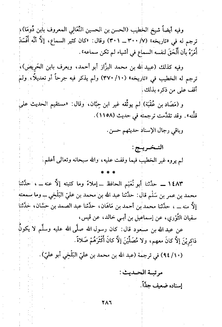 ١٤٨٣ - حدَّثنا أبو نُعَيْم الحافظ -إملاءً وما كتبته إلَّا عنه-، حدَّثنا محمد بن عمر بن سَلْم قال: حدَّثنا عبد اللَّه بن محمد بن عليّ البَلْخِي -وما سمعته إلَّا منه-، حدَّثنا محمد بن أحمد بن مَاهَان، حدَّثنا عبد الصمد بن حسَّان، حدَّثنا سفيان الثَّوْري، عن إسماعيل بن أبي خالد، عن قيس،