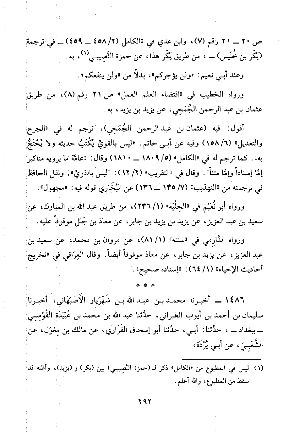 ١٤٨٦ - أخبرنا محمد بن عبد اللَّه بن شَهْرَيَار الأَصْبَهَاني، أخبرنا سليمان بن أحمد بن أيوب الطبراني، حدَّثنا عبد اللَّه بن محمد بن عُبَيْدَة القُوْمِسِي -ببغداد-، حدَّثنا: أبي، حدَّثنا أبو إسحاق الفَزَاري، عن مالك بن مِغْوَل؛ عن الشَّعْبِيّ، عن أبي بُرْدَة،