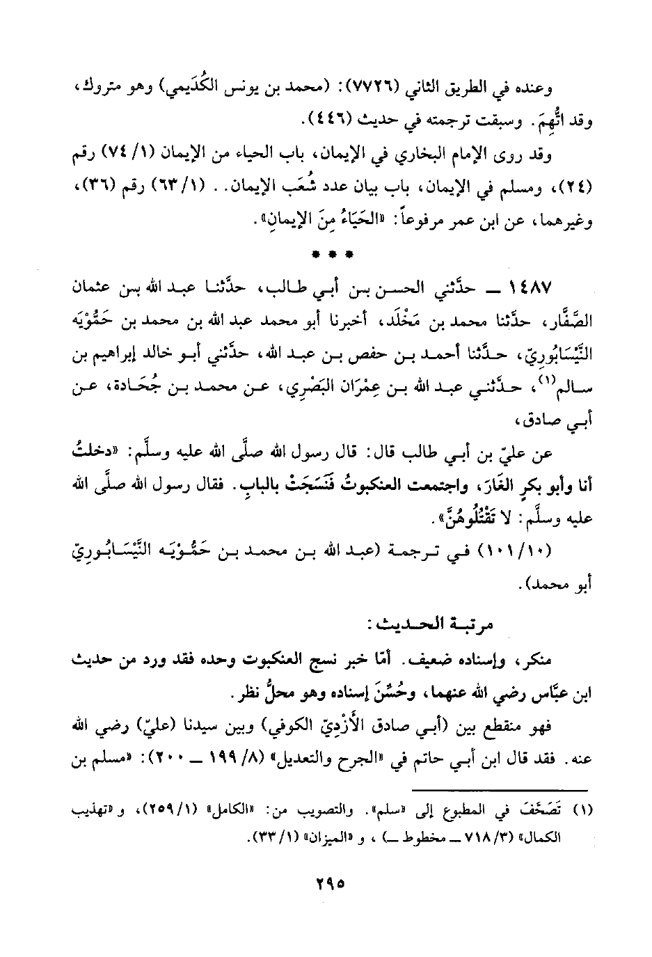 ١٤٨٧ - حدَّثني الحسن بن أبي طالب، حدَّثنا عبد اللَّه بن عثمان الصَّفَّار، حدَّثنا محمد بن مَخْلَد، أخبرنا أبو محمد عبد اللَّه بن محمد بن حَمُّوْيَه النَّيْسَابُورِيّ، حدَّثنا أحمد بن حفص بن عبد اللَّه، حدَّثني أبو خالد إبراهيم بن سالم (¬١)، حدَّثني عبد اللَّه بن عِمْران البَصْري، عن محمد بن جُحَادة، عن أبي صادق،