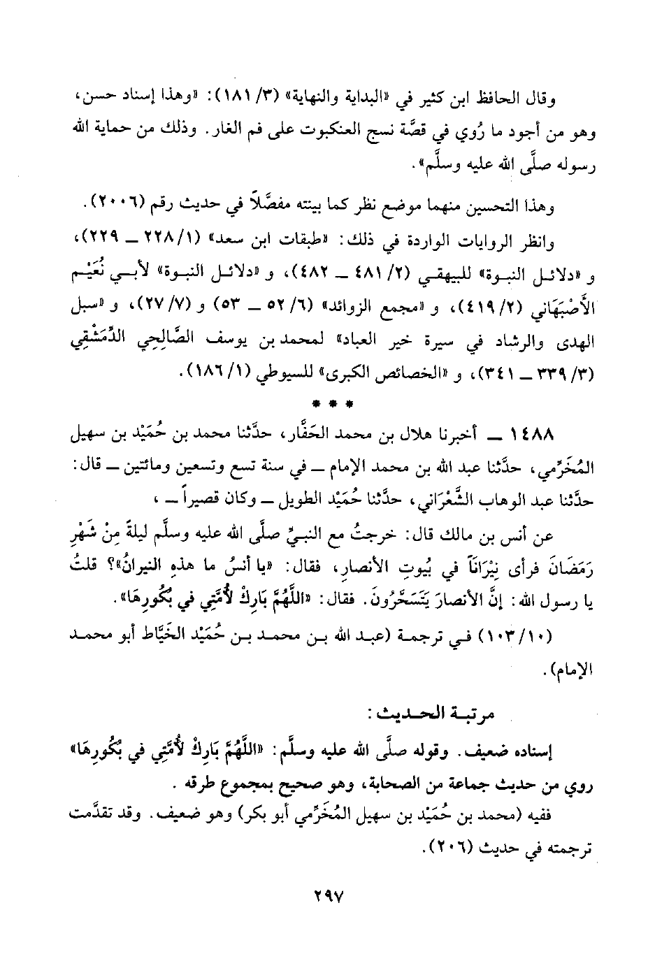 ١٤٨٨ - أخبرنا هلال بن محمد الحَفَّار، حدَّثنا محمد بن حُمَيْد بن سُهَيْل المُخَرِّمي، حدَّثنا عبد اللَّه بن محمد الإِمام -في سنة تسع وتسعين ومائتين- قال: حدَّثنا عبد الوهاب الشَّعْرَاني، حدَّثنا حُمَيْد الطويل -وكان قصيرًا-،