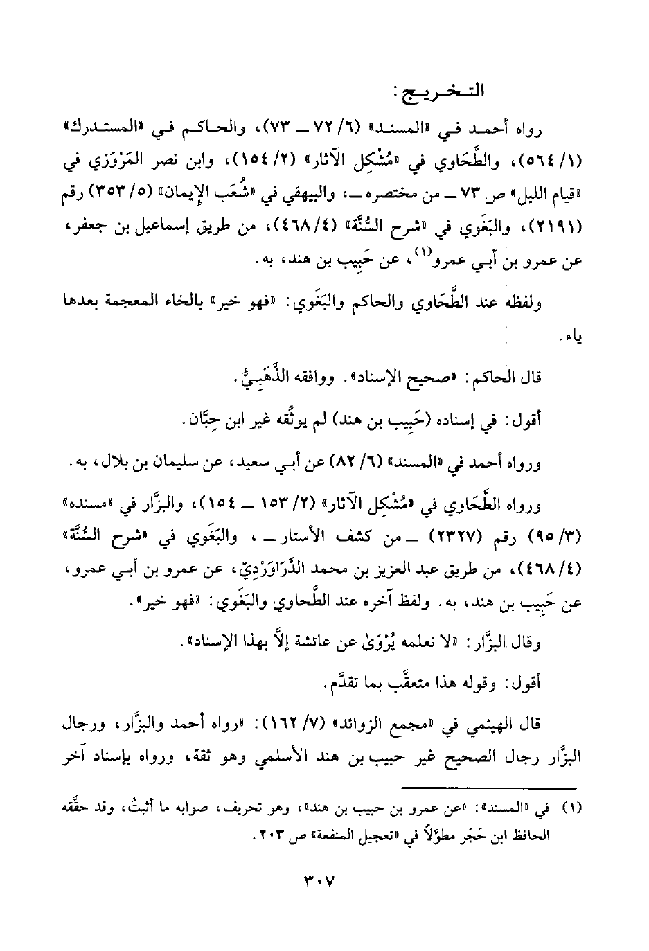رواه أحمد في "المسند" (٦/ ٧٢ - ٧٣)، والحاكم في "المستدرك" (١/ ٥٦٤)، والطَّحَاوي في "مُشْكِل الآثار" (٢/ ١٥٤)، وابن نصر المَرْوَزي في "قيام الليل" ص ٧٣ - من مختصره-، والبيهقي في "شُعَب الإِيمان" (٥/ ٣٥٣) رقم (٢١٩١)، والبَغَوي في "شرح السُّنَّة" (٤/ ٤٦٨)، من طريق إسماعيل بن جعفر، عن عمرو بن أبي عمرو (¬١)، عن حَبِيب بن هند، به.