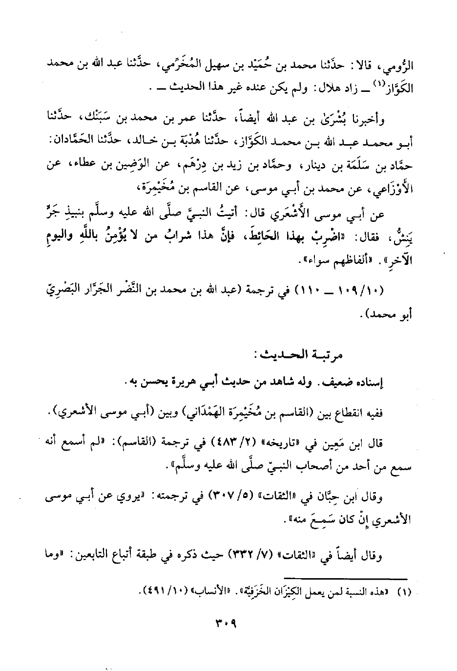 عن أبي موسى الأَشْعَري قال: أتيتُ النبيَّ صلَّى اللَّه عليه وسلَّم بنبيذٍ جَرٍّ يَنِشُّ، فقال: "اضْرِبْ بهذا الحَائِطَ، فإنَّ هذا شرابُ من لا يُؤْمِنُ باللَّهِ واليومِ الآخرِ". "ألفاظهم سواء".