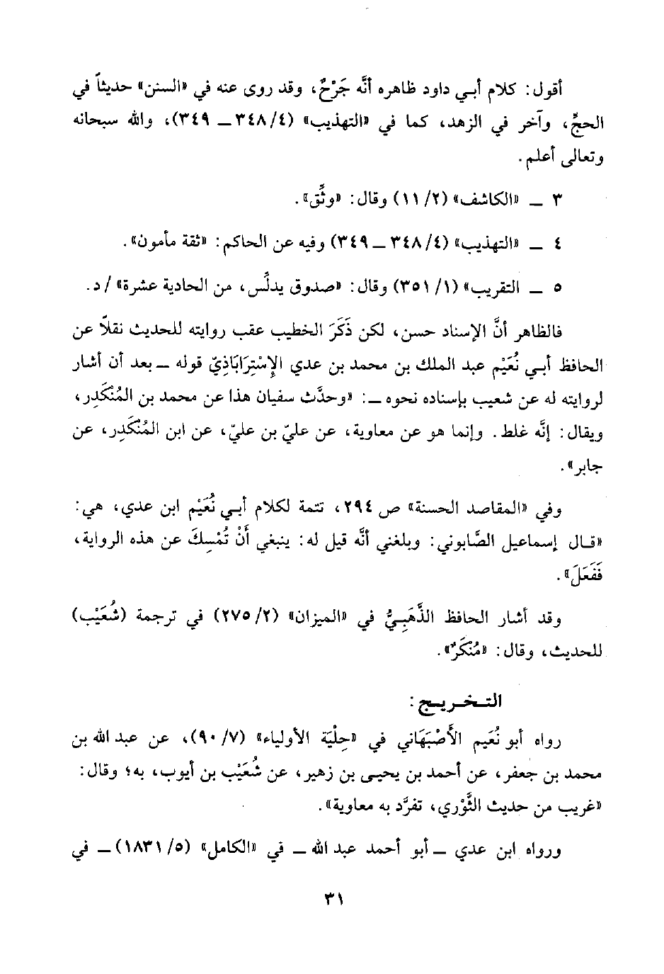 وفي "المقاصد الحسنة" ص ٢٩٤، تتمة لكلام أبي نُعَيْم ابن عدي، هي: "قال إسماعيل الصَّابوني: وبلغني أنَّه قيل له: ينبغي أَنْ تُمْسِكَ عن هذه الرواية، فَفَعَلَ".
