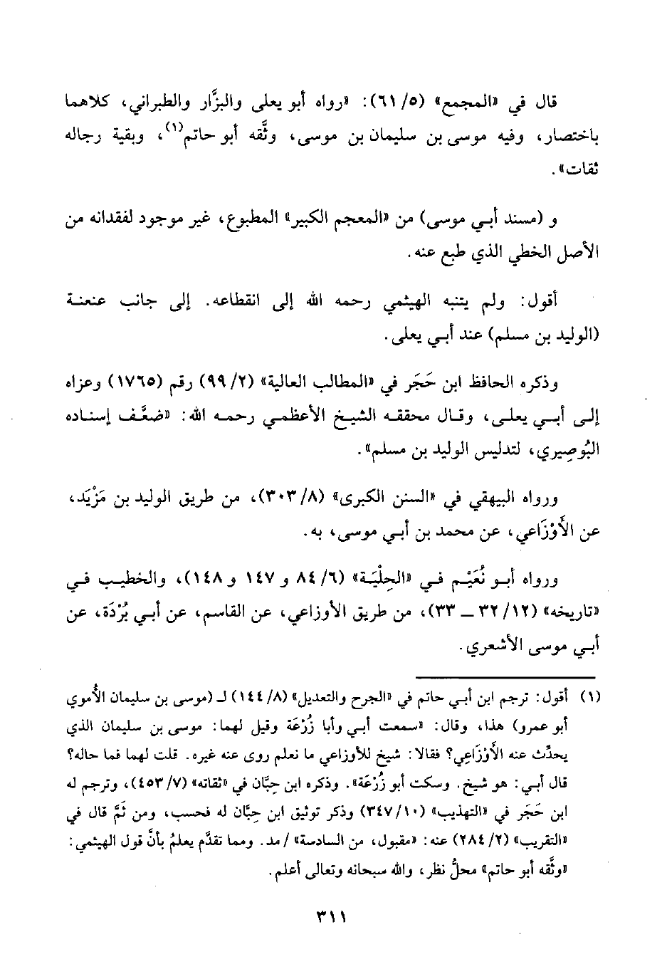 (¬١) أقول: ترجم ابن أبي حاتم في "الجرح والتعديل" (٨/ ١٤٤) لـ (موسى بن سليمان الأُموي أبو عمرو) هذا، وقال: "سمعت أبي وأبا زُرْعَة وقيل لهما: موسى بن سليمان الذي يحدِّث عنه الأَوْزَاعِي؟ فقالا: شيخ للأوزاعي ما نعلم روى عنه غيره. قلت لهما فما حاله؟ قال أبي: هو شيخ. وسكت أبو زُرْعَة". وذكره ابن حِبَّان في "ثقاته" (٧/ ٤٥٣)، وترجم له ابن حَجَر في "التهذيب" (١٠/ ٣٤٧) وذكر توثيق ابن حِبَّان له فحسب، ومن ثَمَّ قال في "التقريب" (٢/ ٢٨٤) عنه: "مقبول، من السادسة"/ مد. ومما تقدَّم يعلمُ بأنَّ قول الهيثمي: "وثَّقه أبو حاتم" محلُّ نظر، واللَّه سبحانه وتعالى أعلم.