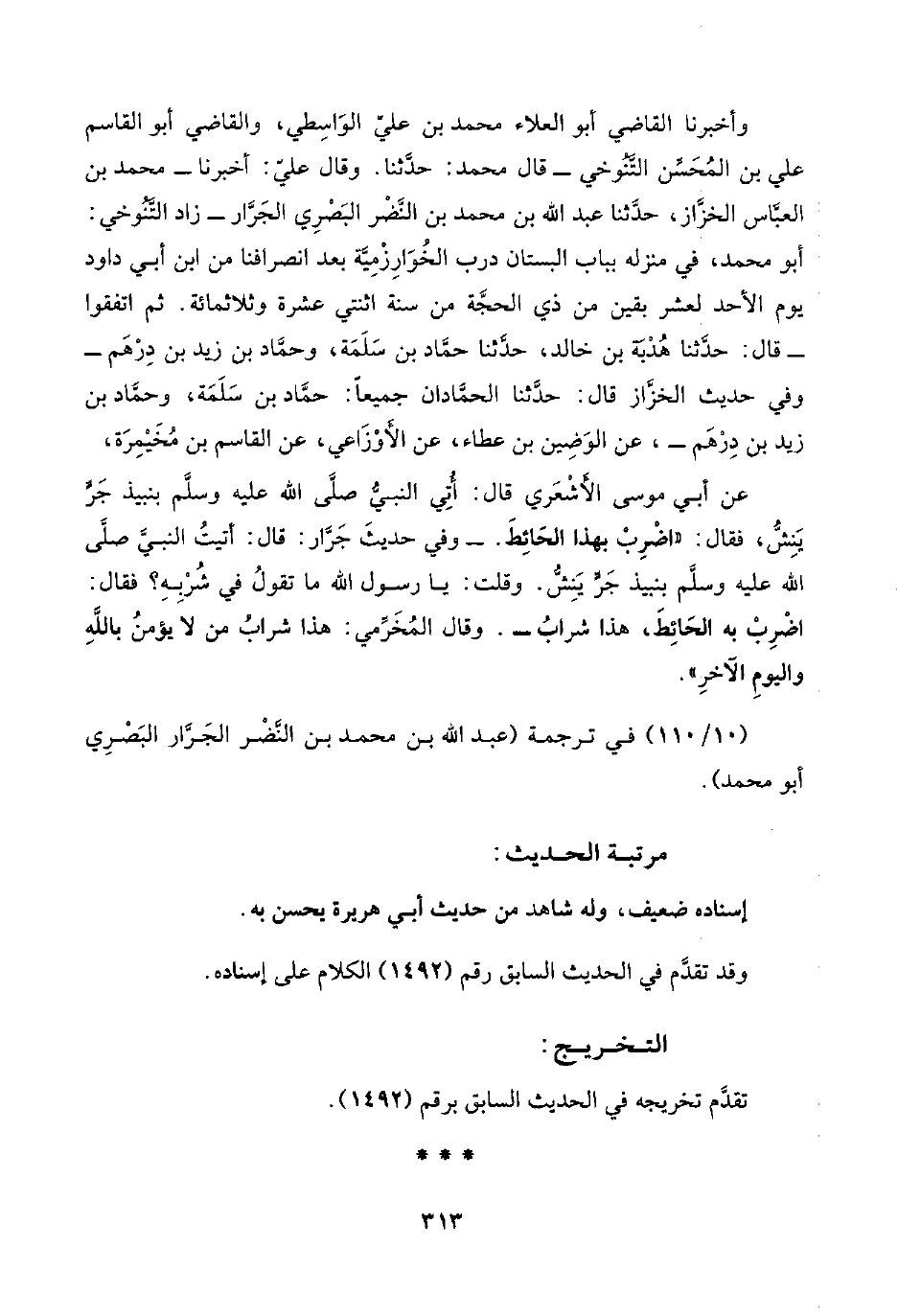 عن أبي موسى الأَشْعَري قال: أُتِي النبيُّ صلَّى اللَّه عليه وسلَّم بنبيذ جَرٍّ يَنِشُّ، فقال: "اضْرِبْ بهذا الحَائِطَ. -وفي حديثَ جَرَّار: قال: أتيتُ النبيَّ صلَّى اللَّه عليه وسلَّم بنبيذ جَرٍّ يَنِشُّ. وقلت: يا رسول اللَّه ما تقولُ في شُرْبِهِ؟ فقال: اضْرِبْ به الحَائِطَ، هذا شرابُ-. وقال المُخرِّمي: هذا شرابُ من لا يؤمنُ باللَّهِ واليومِ الآخرِ".