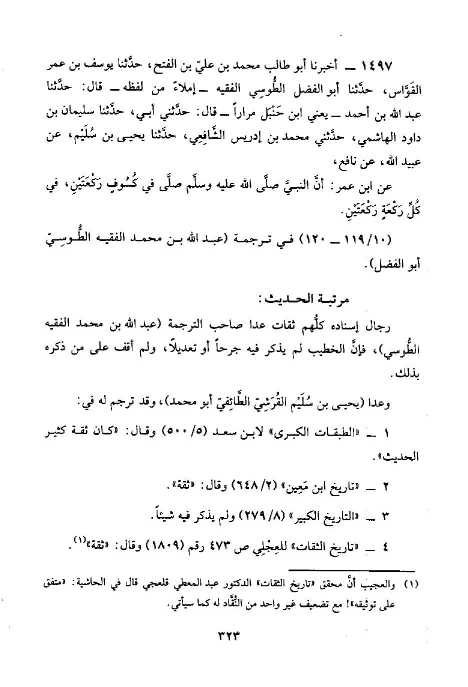 ١٤٩٧ - أخبرنا أبو طالب محمد بن عليّ بن الفتح، حدَّثنا يوسف بن عمر القَوَّاس، حدَّثنا أبو الفضل الطُّوسِي الفقيه -إملاءً من لفظه- قال: حدَّثنا عبد اللَّه بن أحمد -يعني ابن حَنْبَل مرارًا - قال: حدَّثني أبي، حدَّثنا سليمان بن داود الهاشمي، حدَّثني محمد بن إدريس الشَّافِعِي، حدَّثنا يحيى بن سُلَيْم، عن عبيد اللَّه، عن نافع،
