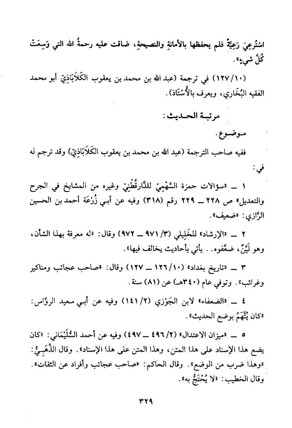 (١٠/ ١٢٧) في ترجمة (عبد اللَّه بن محمد بن يعقوب الكَلَابَاذِيّ أبو محمد الفقيه البُخَاري، ويعرف بالأُسْتَاذ).
