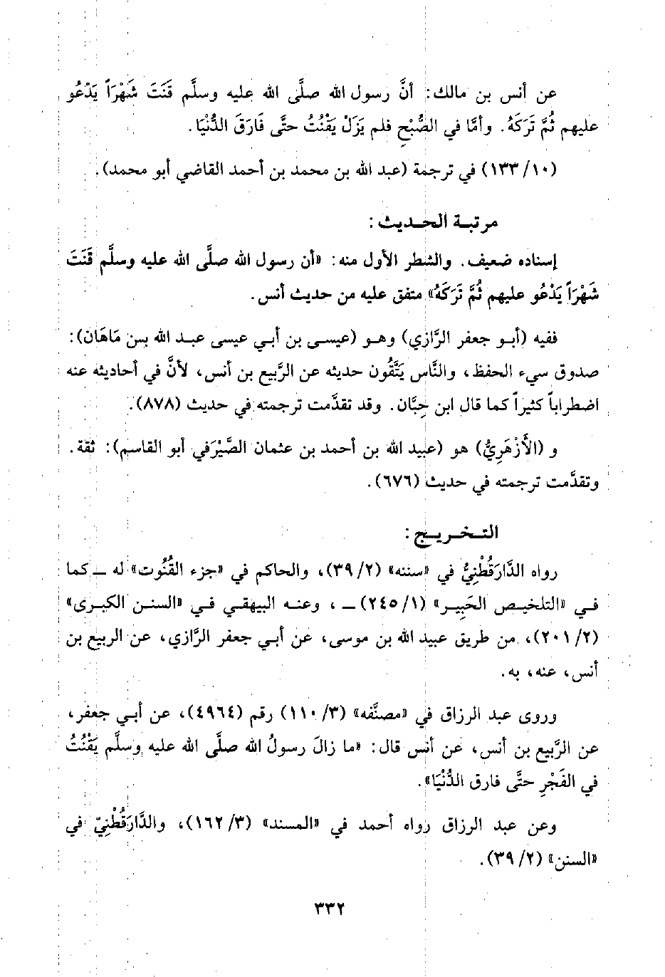 عن أنس بن مالك: أنَّ رسول اللَّه صلَّى اللَّه عليه وسلَّم قَنَتَ شَهْرًا يَدْعُو عليهم ثُمَّ تَرَكَهُ. وأمَّا في الصُّبْحِ فلم يَزَلْ يَقْنُتُ حتَّى فَارَقَ الدُّنْيَا.