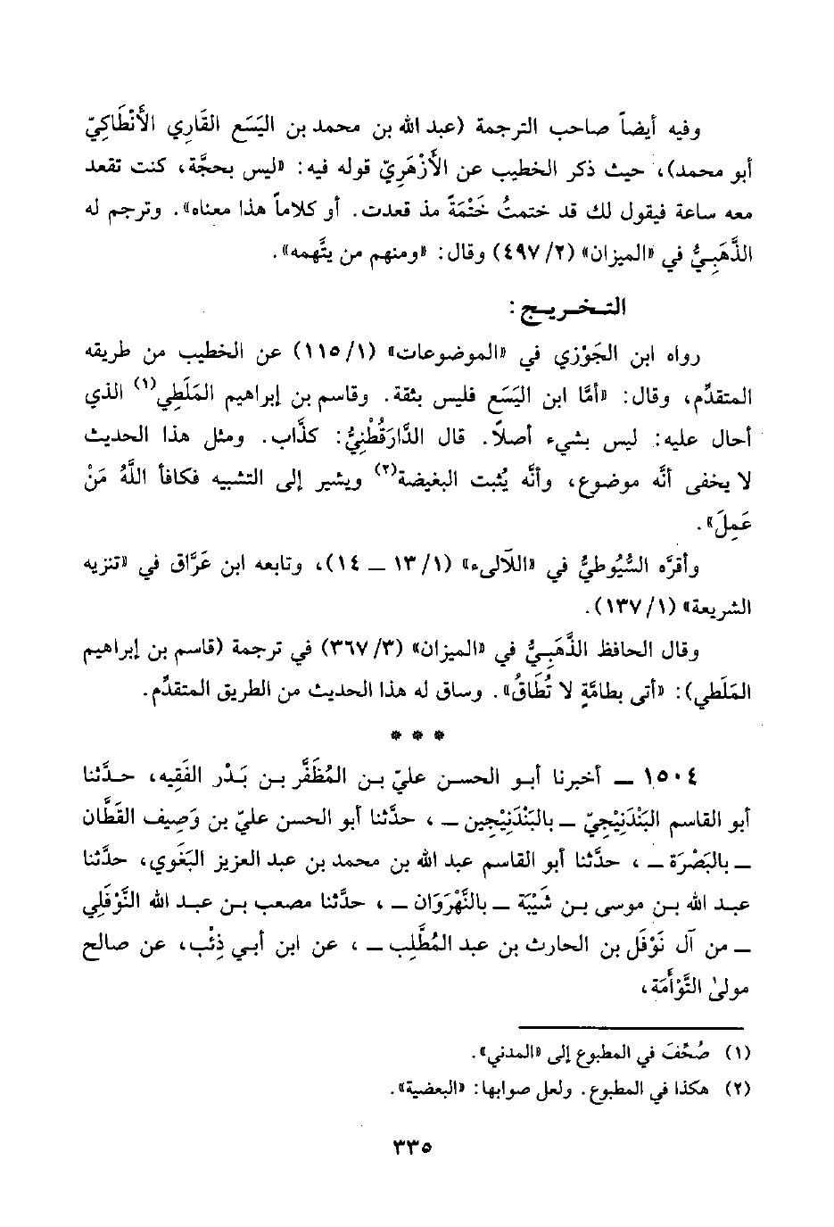 ١٥٠٤ - أخبرنا أبو الحسن عليّ بن المُظَفَّر بن بَدْر الفَقِيه، حدَّثنا أبو القاسم البَنْدَنِيْجِيّ -بالبَنْدَنِيْجِين-، حدَّثنا أبو الحسن عليّ بن وَصِيف القَطَّان -بالبَصْرَة-، حدَّثنا أبو القاسم عبد اللَّه بن محمد بن عبد العزيز البَغَوي، حدَّثنا عبد اللَّه بن موسى بن شَيْبَة -بالنَّهْرَوَان-، حدَّثنا مصعب بن عبد اللَّه النَّوْفَلِي -من آل نَوْفَل بن الحارث بن عبد المُطَّلِب-، عن ابن أبي ذِئْب، عن صالح مولى التَّوْأَمَة،