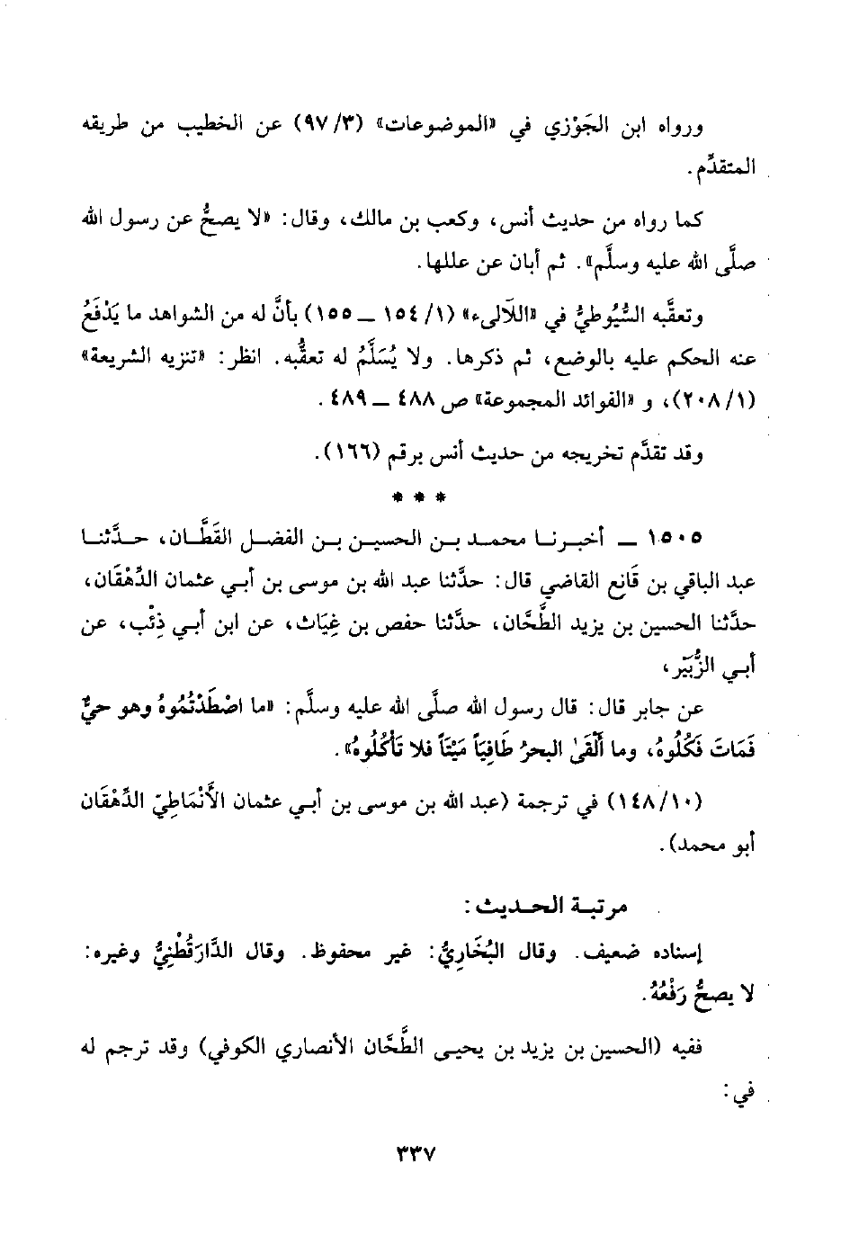 ١٥٠٥ - أخبرنا محمد بن الحسين بن الفضل القَطَّان، حدَّثنا عبد الباقي بن قَانِع القاضي قال: حدَّثنا عبد اللَّه بن موسى بن أبي عثمان الدِّهْقَان، حدَّثنا الحسين بن يزيد الطَّحَّان، حدَّثنا حفص بن غِيّاث، عن ابن أبي ذِئْب، عن أبي الزُّبَيْر،