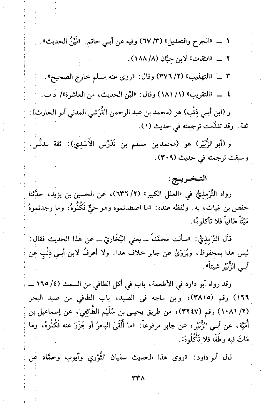 قال التِّرْمِذِيُّ: "سألت محمَّدًا -يعني البُخَاريّ- عن هذا الحديث فقال: ليس هذا بمحفوظ، ويُرْوَى عن جابر خلاف هذا. ولا أعرفُ لابن أبي ذِئْبٍ عن أبي الزُّبَيْر شيئًا".