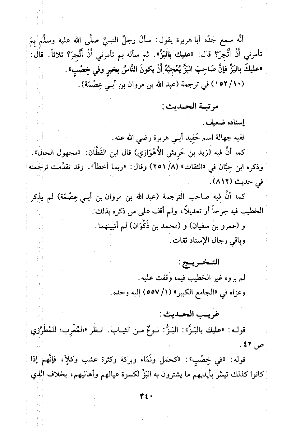 أنَّه سمع جدَّه أبا هريرة يقول: سألَ رجلٌ النبيَّ صلَّى اللَّه عليه وسلَّم بِمَ تأمرني أَنْ أَتَّجِرَ؟ قال: "عليك بالبَزِّ". ثم سأله بم تأمرني أَنْ أَتَّجِرَ؟ ثلاثًا. قال: "عليكَ بالبَزِّ فإنَّ صَاحِبَ البَزِّ يُعْجِبُهُ أَنْ يكونَ النَّاسُ بخيرٍ وفي خِصْبٍ".
