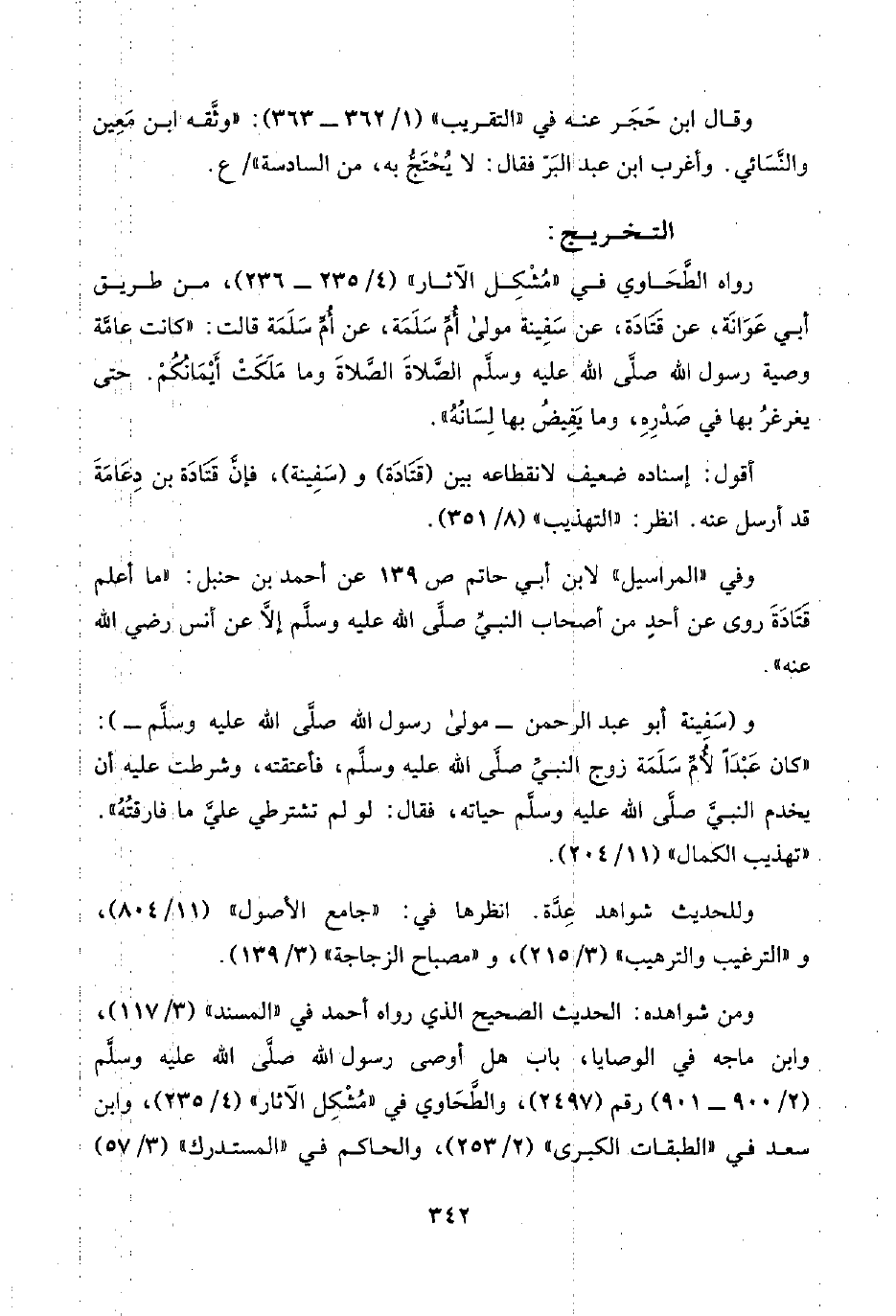 رواه الطَّحَاوي في "مُشْكِل الآثار" (٤/ ٢٣٥ - ٢٣٦)، من طريق أبي عَوَانَة، عن قَتَادَة، عن سَفِينة مولى أُمِّ سَلَمَة، عن أُمِّ سَلَمَة قالت: "كانت عامَّة وصية رسول اللَّه صلَّى اللَّه عليه وسلَّم الصَّلاةَ الصَّلاةَ وما مَلَكَتْ أَيْمَانُكُمْ. حتى يغرغرُ بها في صَدْرِهِ، وما يَفِيضُ بها لِسَانُهُ".