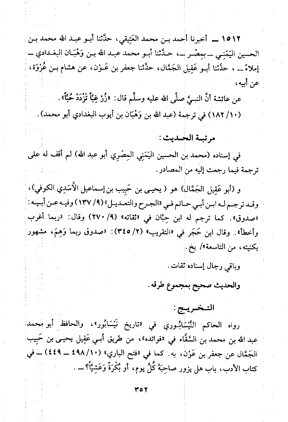 ١٥١٢ - أخبرنا أحمد بن محمد العَتِيقي، حدَّثنا أبو عبد اللَّه محمد بن الحسين اليَمَنِي -بمِصْر-، حدَّثنا أبو محمد عبد اللَّه بن وَهْبَان البغدادي - إملاءً-، حدَّثنا أبو عَقِيل الجَمَّال، حدَّثنا جعفر بن عَوْن، عن هشام بن عُرْوَة، عن أبيه،