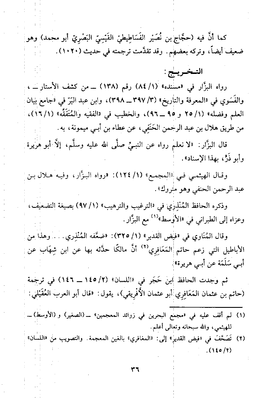 وقال المُنَاوي في "فيض القدير" (١/ ٣٢٥): "ضعَّفه المُنْذِري. . . . وهذا من الأباطيل التي زعم حاتم المَعَافِري (¬٢) أنَّ مالكًا حدَّثه بها عن ابن شِهَاب عن أبي سَلَمَة عن أبي هريرة".