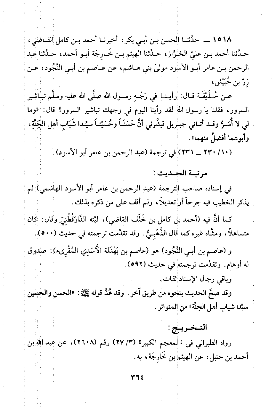 ١٥١٨ - حدَّثنا الحسن بن أبي بكر، أخبرنا أحمد بن كامل القاضي، حدَّثنا أحمد بن علي الخرَّاز، حدَّثنا الهيثم بن خَارِجَة أبو أحمد، حدَّثنا عبد الرحمن بن عامر أبو الأسود مولى بني هاشم، عن عاصم بن أبي النَّجُود، عن زِرّ بن حُبَيْش،