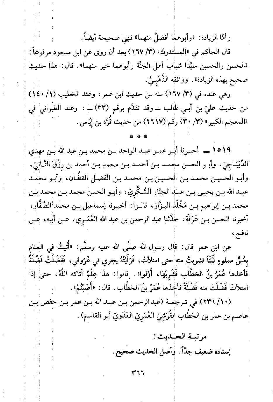 ١٥١٩ - أخبرنا أبو عمر عبد الواحد بن محمد بن عبد اللَّه بن مهدي الدِّيْبَاجِيّ، وأبو الحسن محمد بن أحمد بن محمد بن أحمد بن رِزْق التَّانِيّ، وأبو الحسين محمد بن الحسين بن محمد بن الفضل القطَّان، وأبو محمد عبد اللَّه بن يحيى بن عبد الجبَّار السُّكَّرِيّ، وأبو الحسن محمد بن محمد بن محمد بن إبراهيم بن مَخْلَد البزَّاز، قالوا: أخبرنا إسماعيل بن محمد الصَّفَّار، أخبرنا الحسن بن عَرَفَة، حدَّثنا عبد الرحمن بن عبد اللَّه العُمَرِي، عن أبيه، عن نافع،