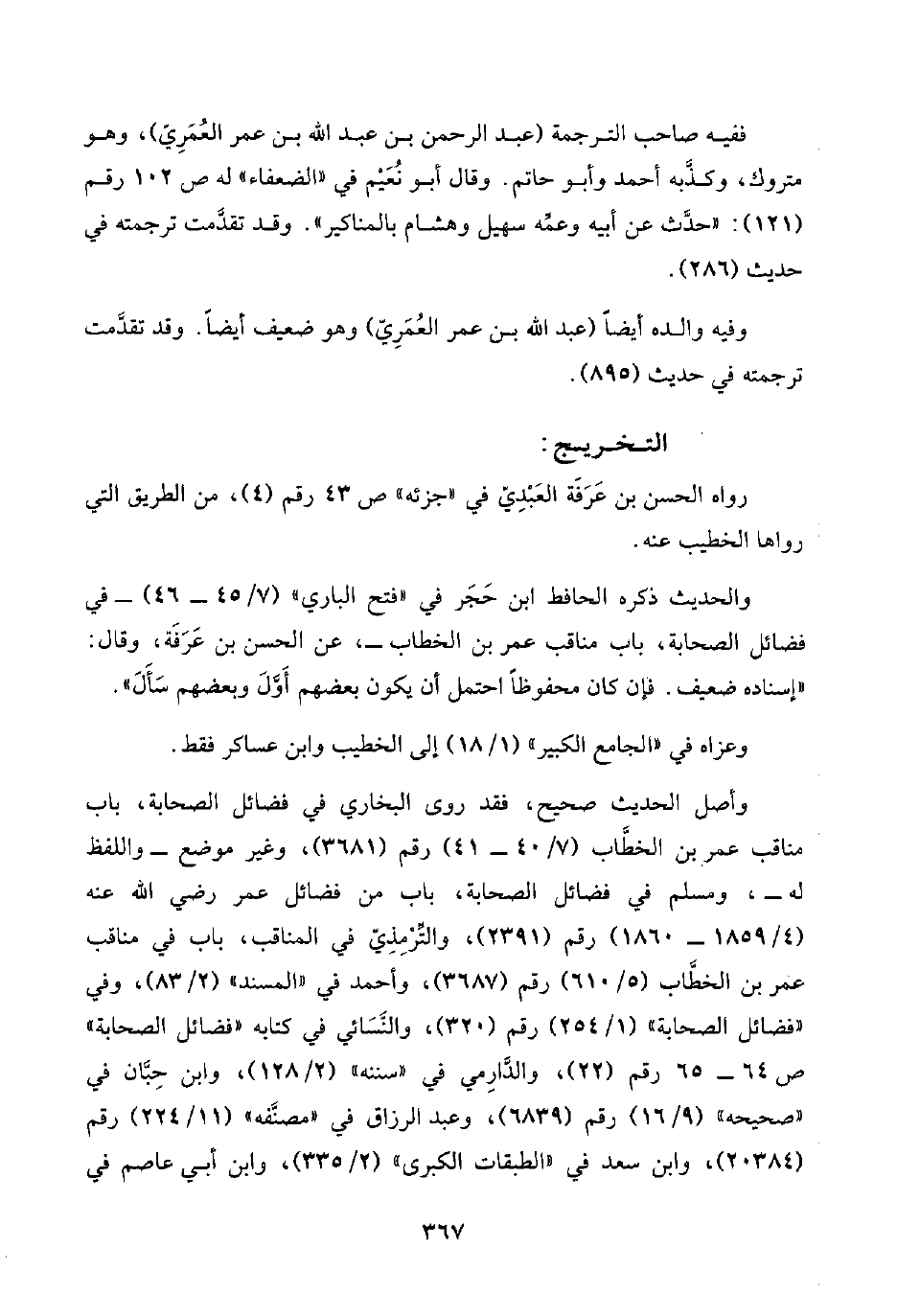 ففيه صاحب الترجمة (عبد الرحمن بن عبد اللَّه بن عمر العُمَرِيّ)، وهو متروك، وكذَّبه أحمد وأبو حاتم. وقال أبو نُعَيْم في "الضعفاء" له ص ١٠٢ رقم (١٢١): "حدَّث عن أبيه وعمِّه سهيل وهشام بالمناكير". وقد تقدَّمت ترجمته في حديث (٢٨٦).