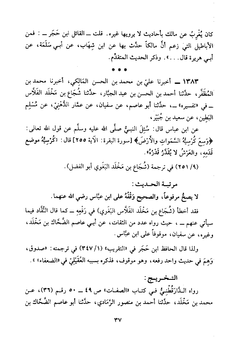 ١٣٨٣ - أخبرنا عليّ بن محمد بن الحسن المَالِكي، أخبرنا محمد بن المُظَفَّر، حدَّثنا أحمد بن الحسن بن عبد الجَبَّار، حدَّثنا شُجَاع بن مَخْلَد الفَلَّاس -في "تفسيره"-، حدَّثنا أبو عاصم، عن سفيان، عن عمَّار الدُّهْنِيّ، عن مُسْلِم البَطِين، عن سعيد بن جُبَيْر،