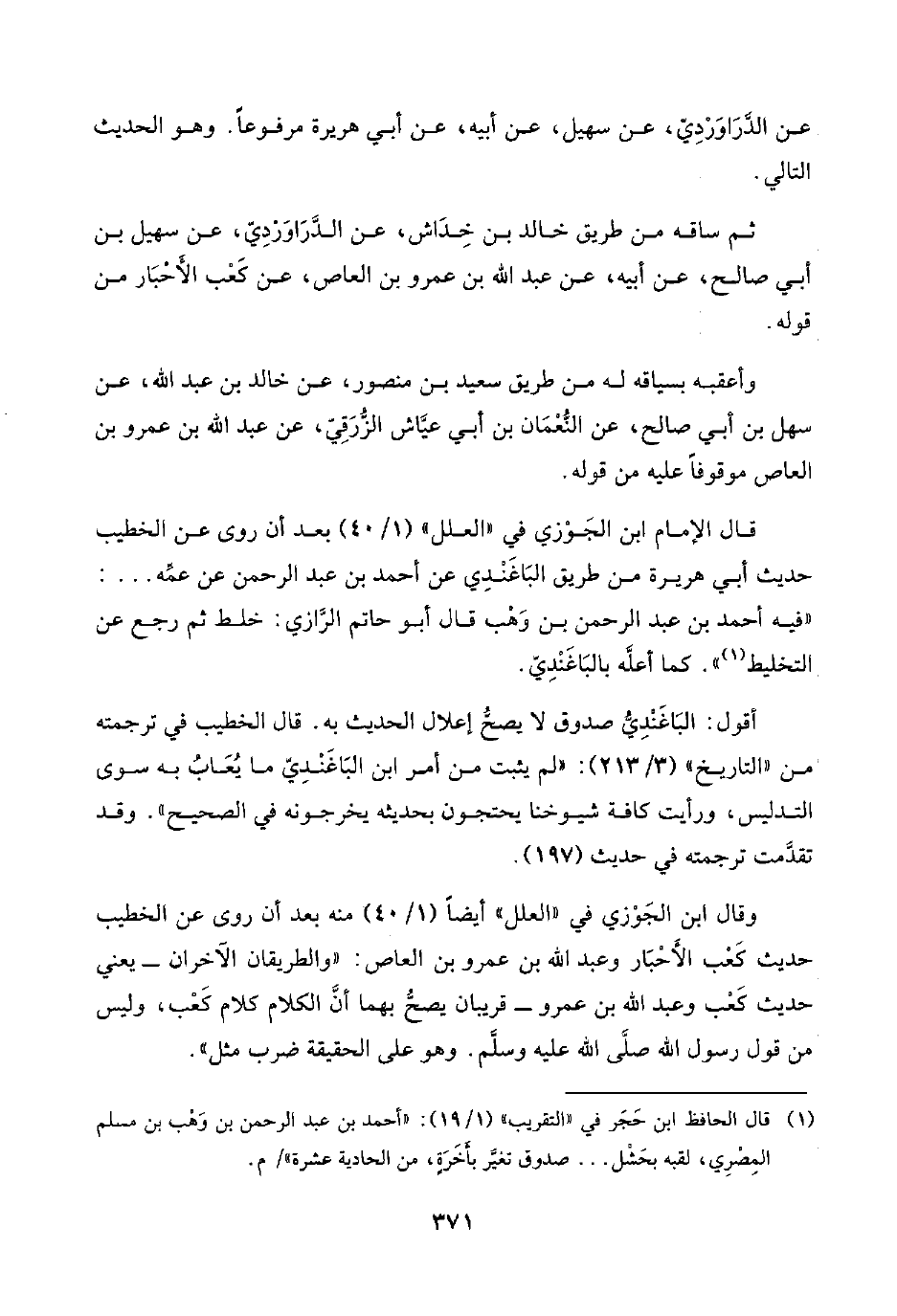قال الإمام ابن الجَوْزي في "العلل" (١/ ٤٠) بعد أن روى عن الخطيب حديث أبي هريرة من طريق البَاغَنْدِي عن أحمد بن عبد الرحمن عن عمِّه. . .: "فيه أحمد بن عبد الرحمن بن وَهْب قال أبو حاتم الرَّازي: خلط ثم رجع عن التخليط (¬١) ". كما أعلَّه بالبَاغَنْدِيّ.