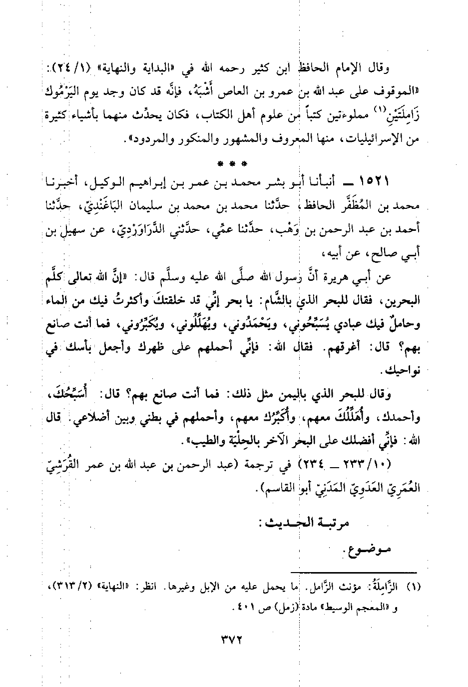 وقال الإمام الحافظ ابن كثير رحمه اللَّه في "البداية والنهاية" (١/ ٢٤): "الموقوف على عبد اللَّه بن عمرو بن العاص أشْبَهُ، فإنَّه قد كان وجد يوم اليَرْمُوك زَامِلَتَيْنِ (¬١) مملوءتين كتبًا من علوم أهل الكتاب، فكان يحدِّث منهما بأشياء كثيرة من الإسرائيليات، منها المعروف والمشهور والمنكور والمردود".