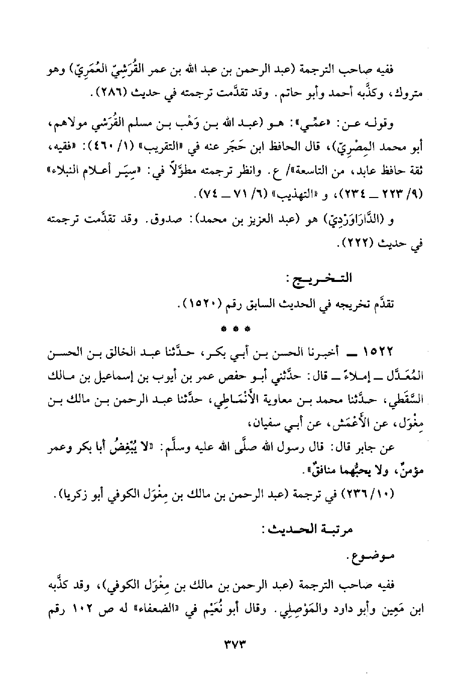 ففيه صاحب الترجمة (عبد الرحمن بن مالك بن مِغْوَل الكوفي)، وقد كذَّبه ابن مَعِين وأبو داود والمَوْصِلِي. وقال أبو نُعَيْم في "الضعفاء" له ص ١٠٢ رقم