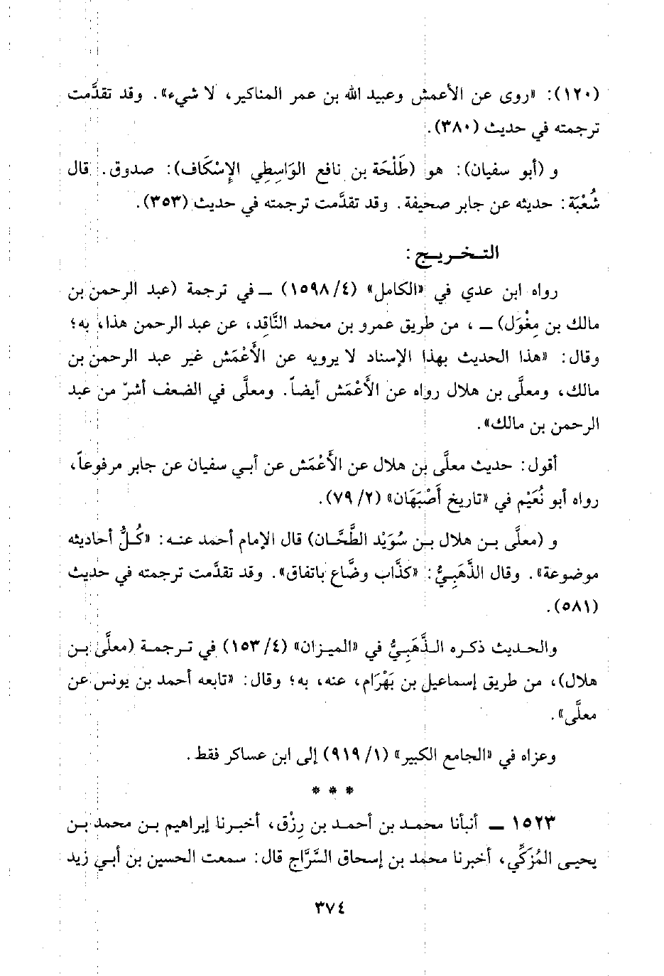 رواه ابن عدي في "الكامل" (٤/ ١٥٩٨) -في ترجمة (عبد الرحمن بن مالك بن مِغْوَل) -، من طريق عمرو بن محمد النَّاقِد، عن عبد الرحمن هذا، به؛ وقال: "هذا الحديث بهذا الإسناد لا يرويه عن الأَعْمَش غير عبد الرحمن بن مالك، ومعلَّى بن هلال رواه عن الأَعْمَش أيضًا. ومعلَّى في الضعف أشرّ من عبد الرحمن بن مالك".