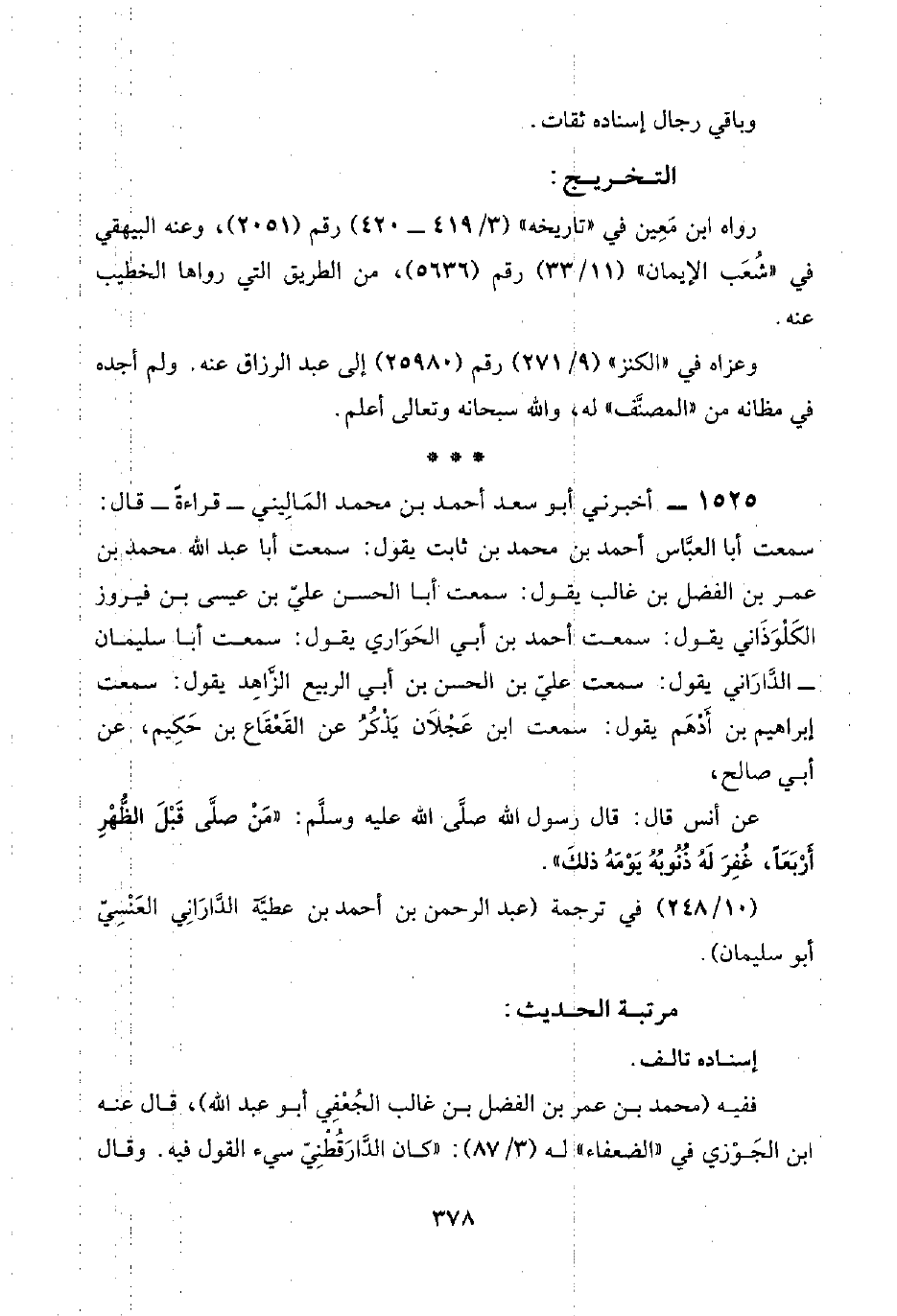 ١٥٢٥ - أخبرني أبو سعد أحمد بن محمد المَالِيني -قراءةً- قال: سمعت أبا العبَّاس أحمد بن محمد بن ثابت يقول: سمعت أبا عبد اللَّه محمد بن عمر بن الفضل بن غالب يقول: سمعت أبا الحسن عليّ بن عيسى بن فيروز الكَلْوَذَاني يقول: سمعت أحمد بن أبي الحَوَاري يقول: سمعت أبا سليمان - الدَّارَاني يقول: سمعت عليّ بن الحسن بن أبي الربيع الزَّاهِد يقول: سمعت إبراهيم بن أَدْهَم يقول: سمعت ابن عَجْلَان يَذْكُرُ عن القَعْقَاع بن حَكِيم، عن أبي صالح،