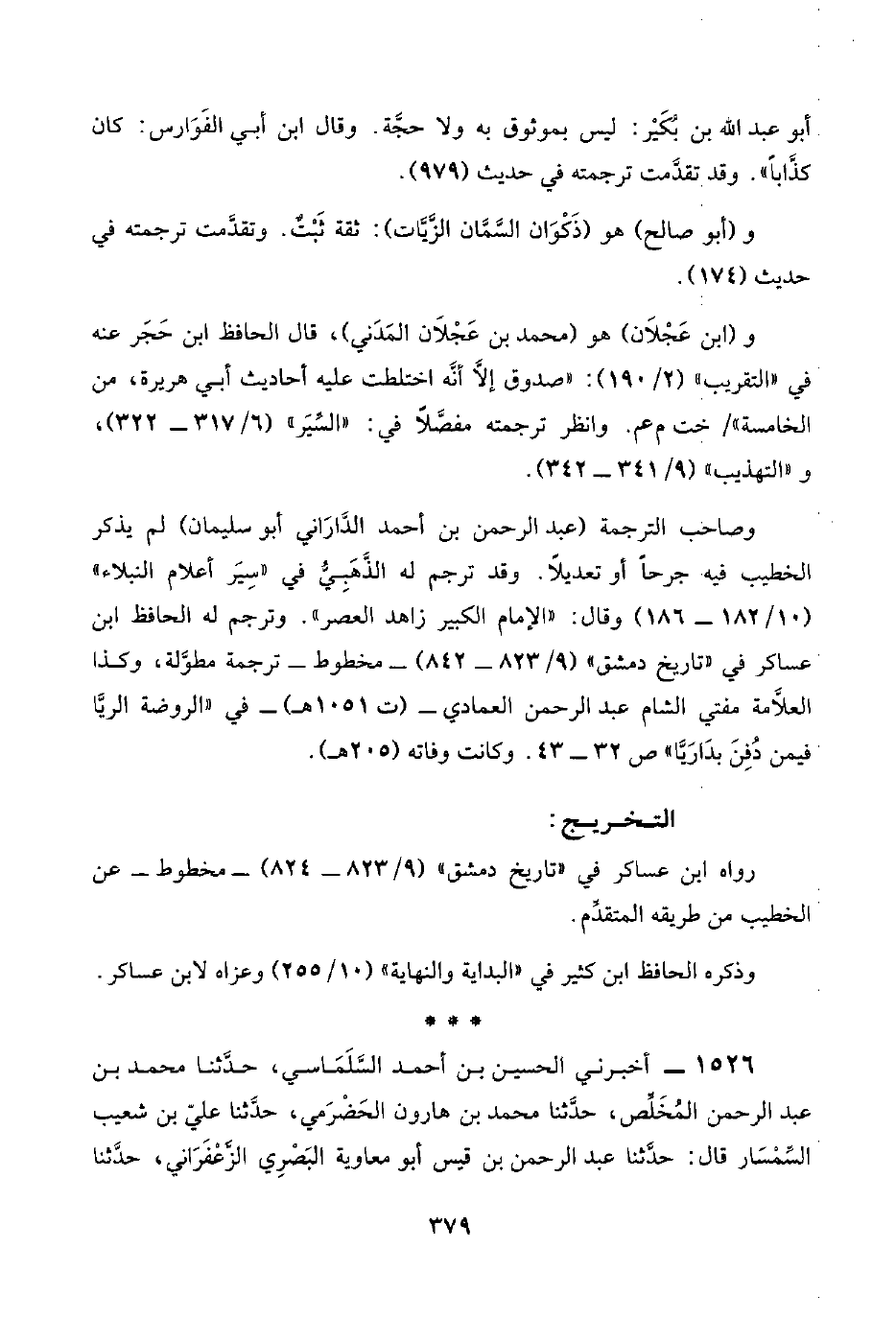 ١٥٢٦ - أخبرني الحسين بن أحمد السَّلَمَاسي، حدَّثنا محمد بن عبد الرحمن المُخَلِّص، حدَّثنا محمد بن هارون الحَضْرَمي، حدَّثنا عليّ بن شعيب السِّمْسَار قال: حدَّثنا عبد الرحمن بن قيس أبو معاوية البَصْرِي الزَّعْفَرَاني، حدَّثنا