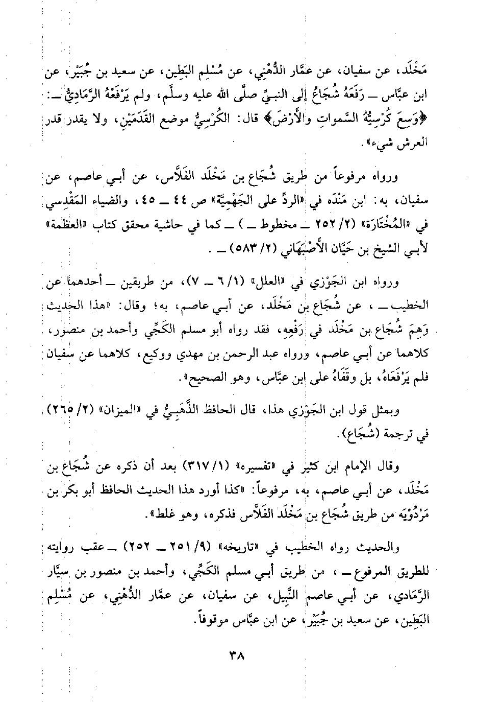 مَخْلَد، عن سفيان، عن عمَّار الدُّهْنِي، عن مُسْلِم البَطِين، عن سعيد بن جُبَيْر، عن ابن عبَّاس -رَفَعَهُ شُجَاع إلى النبيِّ صلَّى اللَّه عليه وسلَّم، ولم يَرْفَعْهُ الرَّمَادِيُّ-: {وَسِعَ كُرْسِيُّهُ السَّمَاوَاتِ وَالْأَرْضَ} قال: الكُرْسِيُّ موضع القَدَمَيْنِ، ولا يقدر قدر العرش شيء".
