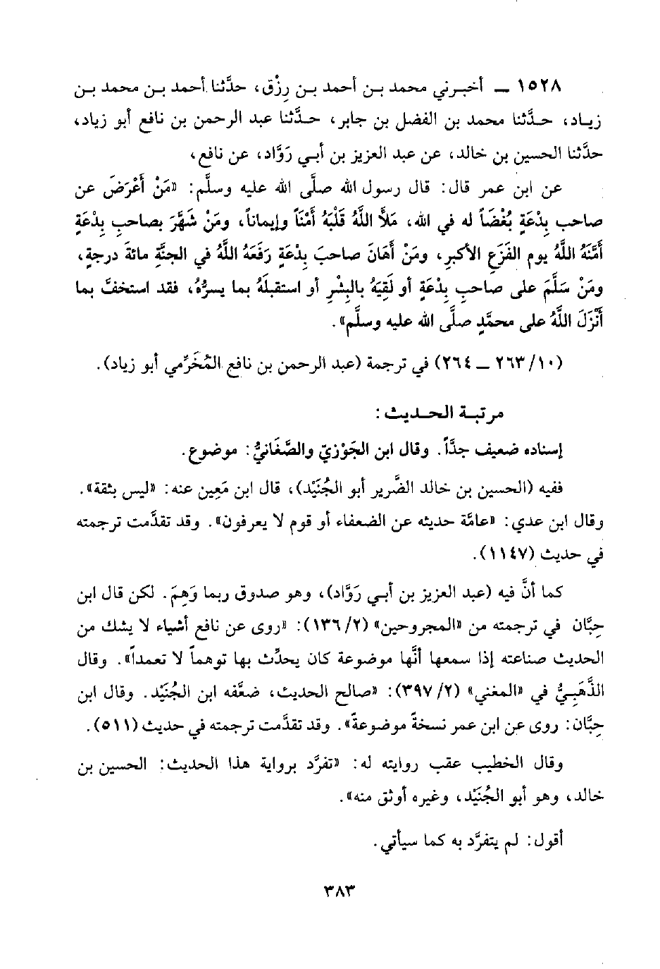 ١٥٢٨ - أخبرني محمد بن أحمد بن رِزْق، حدَّثنا أحمد بن محمد بن زياد، حدَّثنا محمد بن الفضل بن جابر، حدَّثنا عبد الرحمن بن نافع أبو زياد، حدَّثنا الحسين بن خالد، عن عبد العزيز بن أبي رَوَّاد، عن نافع،