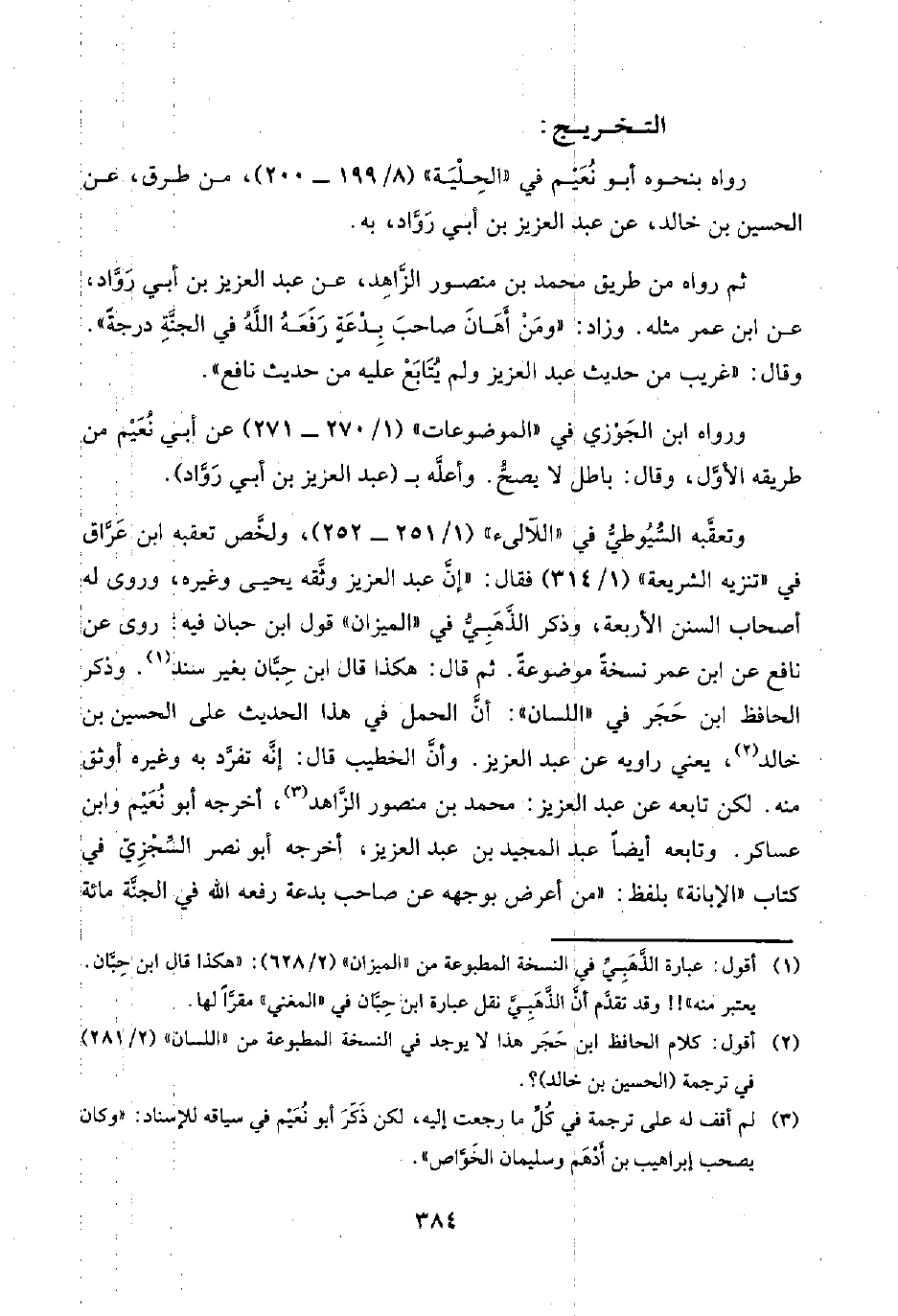 وتعقَّبه السُّيُوطيُّ في "اللآلئ" (١/ ٢٥١ - ٢٥٢)، ولخَّص تعقبه ابن عَرَّاق في "تنزيه الشريعة" (١/ ٣١٤) فقال: "إنَّ عبد العزيز وثَّقه يحيى وغيره، وروى له أصحاب السنن الأربعة، وذكر الذَّهَبِيُّ في "الميزان" قول ابن حبان فيه: روى عن نافع عن ابن عمر نسخةً موضوعةً. ثم قال: هكذا قال ابن حِبَّان بغير سند (¬١). وذكر الحافظ ابن حَجَر في "اللسان": أنَّ الحمل في هذا الحديث على الحسين بن خالد (¬٢)، يعني راويه عن عبد العزيز. وأنَّ الخطيب قال: إنَّه تفرَّد به وغيره أوثق منه. لكن تابعه عن عبد العزيز: محمد بن منصور الزَّاهد (¬٣)، أخرجه أبو نُعَيْم وابن عساكر. وتابعه أيضًا عبد المجيد بن عبد العزيز، أخرجه أبو نصر السِّجْزِيّ في كتاب "الإبانة" بلفظ: "من أعرض بوجهه عن صاحب بدعة رفعه اللَّه في الجنَّة مائة