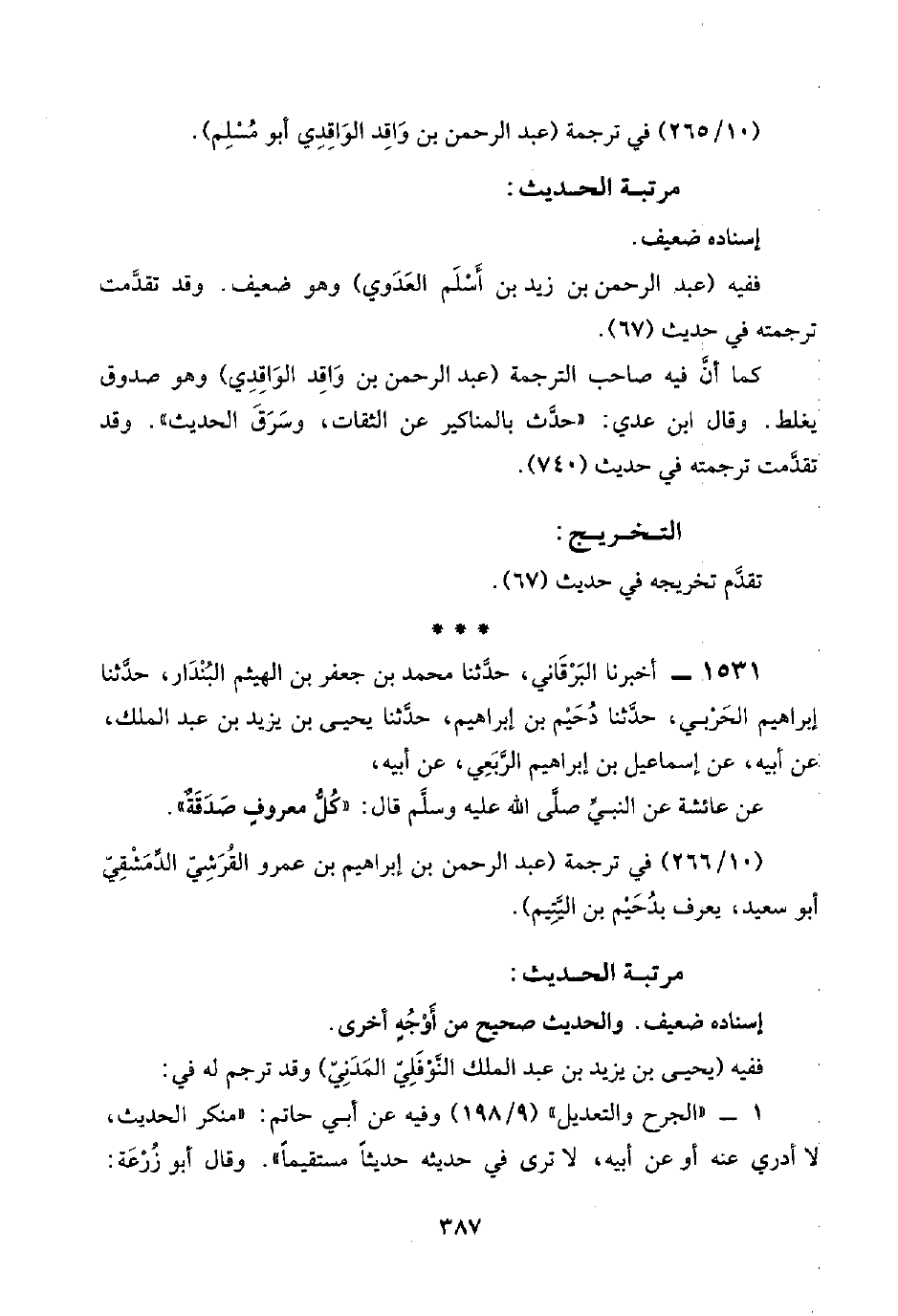 كما أنَّ فيه صاحب الترجمة (عبد الرحمن بن وَاقِد الوَاقِدِي) وهو صدوق يغلط. وقال ابن عدي: "حدَّث بالمناكير عن الثقات، وسَرَقَ الحديث". وقد تقدَّمت ترجمته في حديث (٧٤٠).