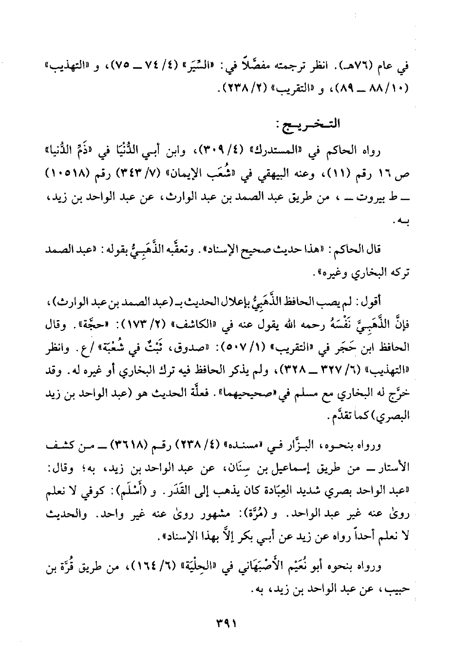 قال الحاكم: "هذا حديث صحيح الإسناد". وتعقَّبه الذَّهَبِيُّ بقوله: "عبد الصمد تركهـ البخاري وغيره".
