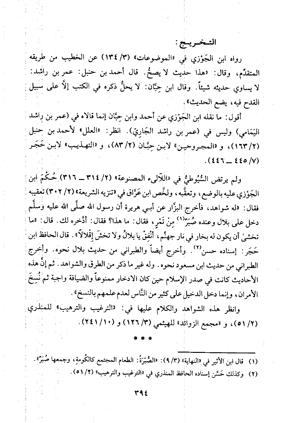 ولم يرتض السُّيُوطيُّ في "اللآلئ المصنوعة" (٢/ ٣١٤ - ٣١٦) حُكْمَ ابن الجَوْزي عليه بالوضع، وتعقَّبه، ولخَّص ابن عَرَّاق في "تنزيه الشريعة" (٢/ ٣٠٢) تعقيبه فقال: "له شواهد، فأخرج البزَّار عن أبي هريرة أن رسول اللَّه صلَّى اللَّه عليه وسلَّم دخل على بلال وعنده صُبَرٌ (¬١) من تَمْرٍ، فقال: ما هذا؟ فقال: أدَّخره لك. قال: "ما تخشى أن يكون له بخار في نار جهنَّم، أنْفِقْ يا بلالُ ولا تخشَ إِقْلالًا". قال الحافظ ابن حَجَر: إسناده حسن (¬٢). وأخرج أيضًا والطبراني من حديث بلال نحوه. وأخرج الطبراني من حديث ابن مسعود نحوه. وله غير ما ذكر من الطرق والشواهد. ثم إنَّ هذه الأحاديث كانت في صدر الإسلام حين كان الادخار ممنوعًا والضيافة واجبة ثم نُسِخَ الأمران، وإنما دخل الدخيل على كثير من النَّاس لعدم علمهم بالنسخ".