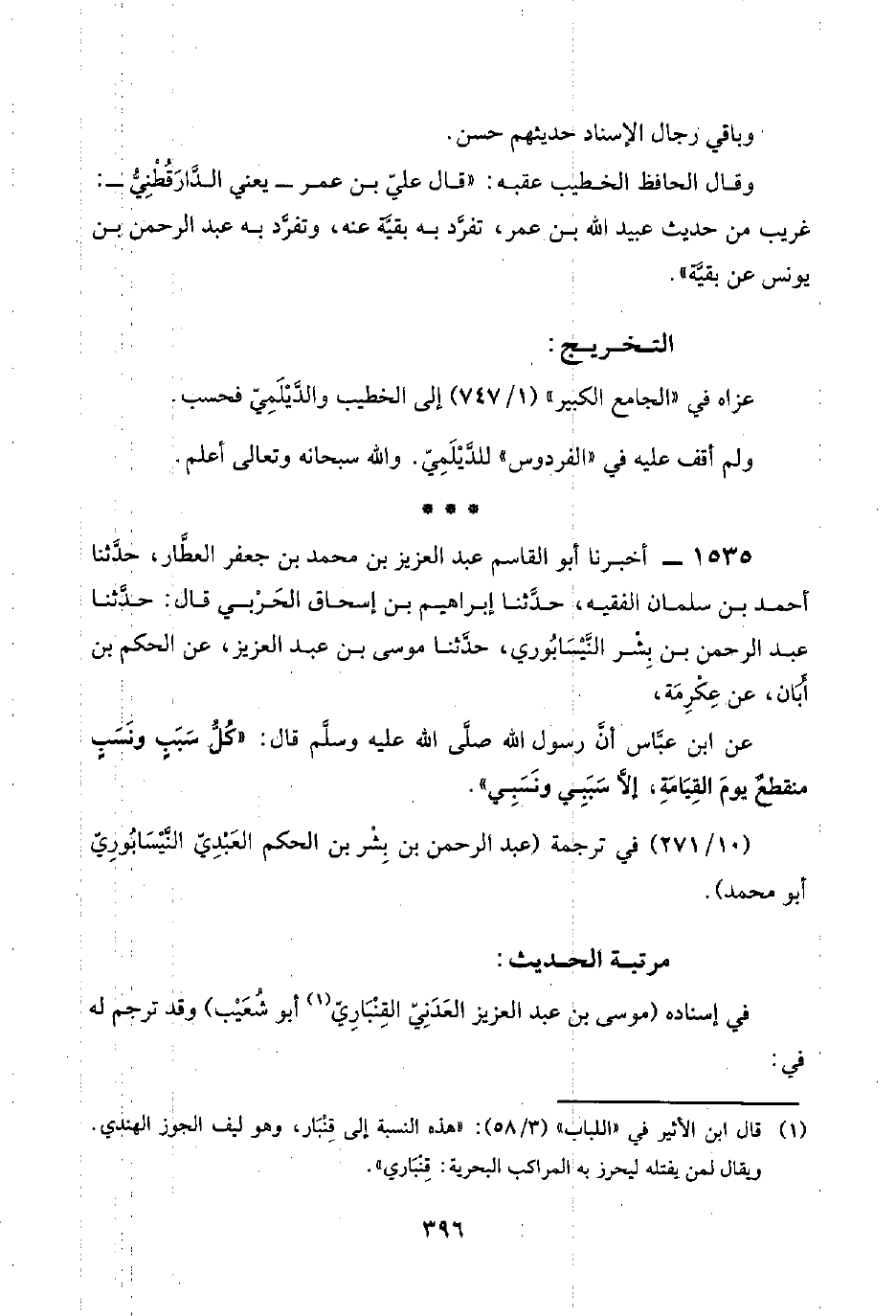 ١٥٣٥ - أخبرنا أبو القاسم عبد العزيز بن محمد بن جعفر العَطَّار، حدَّثنا أحمد بن سلمان الفقيه، حدَّثنا إبراهيم بن إسحاق الحَرْبي قال: حدَّثنا عبد الرحمن بن بِشْر النَّيْسَابُوري، حدَّثنا موسى بن عبد العزيز، عن الحكم بن أَبَان، عن عِكْرِمَة،