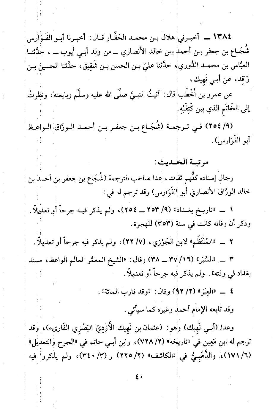 ١٣٨٤ - أخبرني هلال بن محمد الحَفَّار قال: أخبرنا أبو الفَوَارس شُجَاع بن جعفر بن أحمد بن خالد الأنصاري -من ولد أبي أيوب-، حدَّثنا العبَّاس بن محمد الدُّوري، حدَّثنا عليّ بن الحسن بن شَقِيق، حدَّثنا الحسين بن وَاقِد، عن أبي نَهِيك،