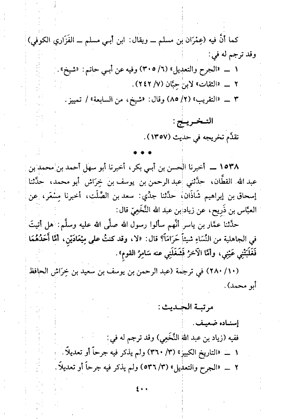 ١٥٣٨ - أخبرنا الحسن بن أبي بكر، أخبرنا أبو سهل أحمد بن محمد بن عبد اللَّه القَطَّان، حدَّثني عبد الرحمن بن يوسف بن خِرَاش أبو محمد، حدَّثنا إسحاق بن إبراهيم شَاذَان، حدَّثنا جدِّي: سعد بن الصَّلْت، أخبرنا مِسْعَر، عن العبَّاس بن ذَرِيح، عن زياد بن عبد اللَّه النَّخَعِيّ قال:
