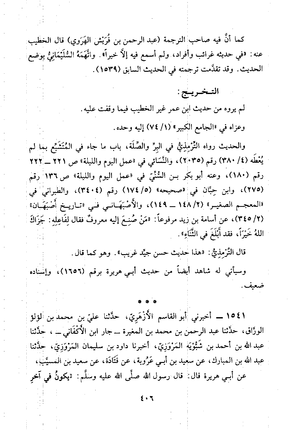١٥٤١ - أخبرني أبو القاسم الأَزْهَرِيُّ، حدَّثنا عليّ بن محمد بن لؤلؤ الورَّاق، حدَّثنا عبد الرحمن بن محمد بن المغيرة -جار ابن الأَكْفَاني-، حدَّثنا عبد اللَّه بن أحمد بن شَبُّوْيَه المَرْوَزِيّ، أخبرنا داود بن سليمان المَرْوَزِيّ، حدَّثنا عبد اللَّه بن المُبَارَك، عن سعيد بن أبي عَرْوبة، عن قَتَادة، عن سعيد بن المسيَّب،