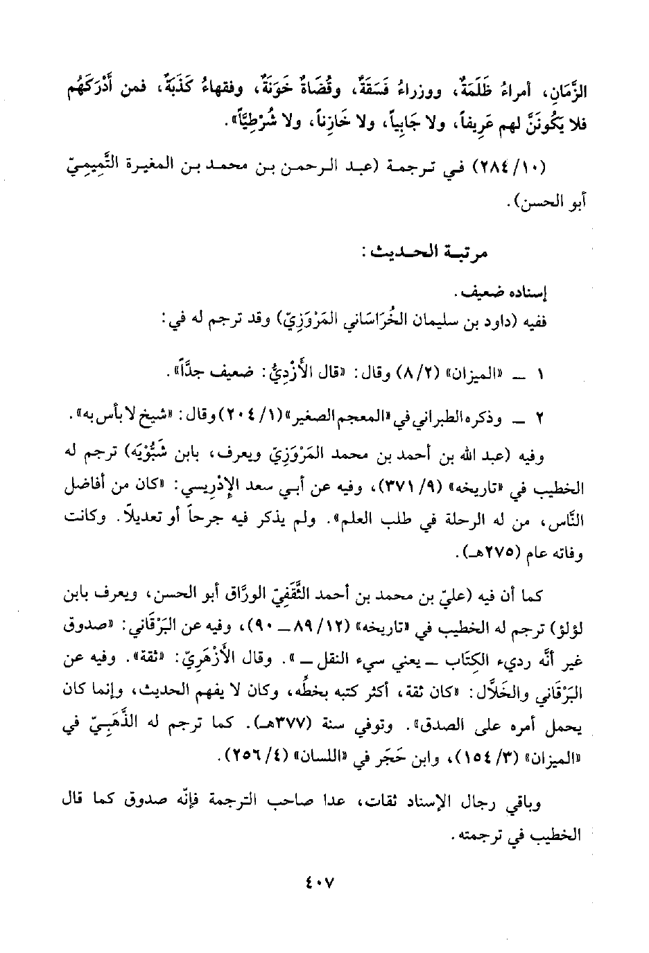 كما أنَّ فيه (عليّ بن محمد بن أحمد الثَّقَفِيّ الورَّاق أبو الحسن، ويعرف بابن لؤلؤ) ترجم له الخطيب في "تاريخه" (١٢/ ٨٩ - ٩٠)، وفيه عن البَرْقَاني: "صدوق غير أنَّه رديء الكِتَاب -يعني سيء النقل-". وقال الأَزْهَرِيّ: "ثقة". وفيه عن البَرْقَاني والخَلَّال: "كان ثقة، أكثر كتبه بخطِّه، وكان لا يفهم الحديث، وإنَّما كان يحمل أمره على الصدق". وتوفي سنة (٣٧٧ هـ). كما ترجم له الذَّهَبِيّ في "الميزان" (٣/ ١٥٤)، وابن حَجَر في "اللسان" (٤/ ٢٥٦).