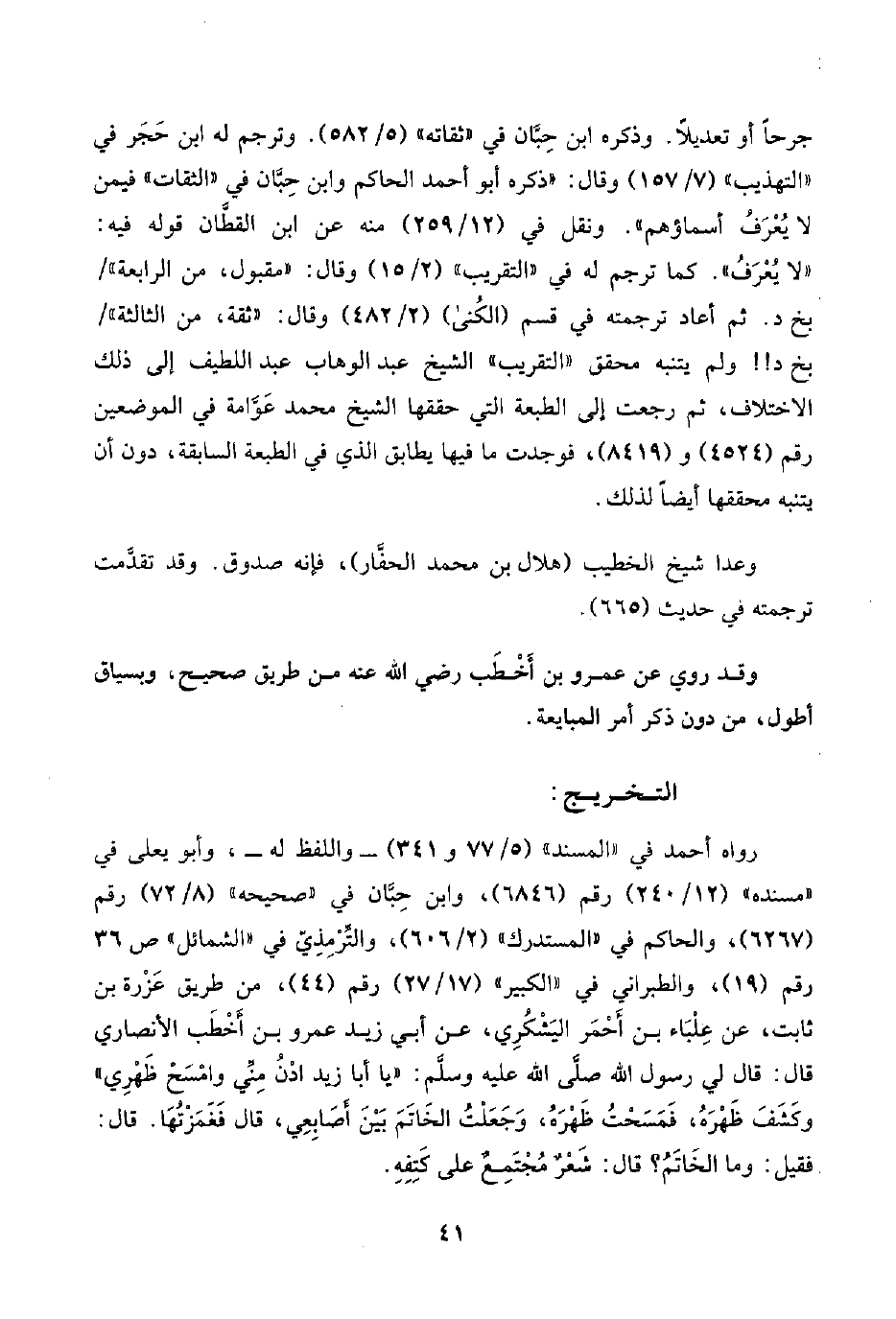 جرحًا أو تعديلًا. وذكره ابن حِبَّان في "ثقاته" (٥/ ٥٨٢). وترجم له ابن حَجَر في "التهذيب" (٧/ ١٥٧) وقال: "ذكره أبو أحمد الحاكم وابن حِبَّان في "الثقات" فيمن لا يُعْرَف أسماؤهم". ونقل في (١٢/ ٢٥٩) منه عن ابن القَطَّان قوله فيه: "لا يُعْرَفُ". كما ترجم له في "التقريب" (٢/ ١٥) وقال: "مقبول، من الرابعة"/ بخ د. ثم أعاد ترجمته في قسم (الكُنَى) (٢/ ٤٨٢) وقال: "ثقة، من الثالثة"/ بخ د! ! ولم يتنبه محقق "التقريب" الشيخ عبد الوهاب عبد اللطيف إلى ذلك الاختلاف، ثم رجعت إلى الطبعة التي حققها الشيخ محمد عَوَّامة في الموضعين رقم (٤٥٢٤) و (٨٤١٩)، فوجدت ما فيها يطابق الذي في الطبعة السابقة، دون أن يتنبه محققها أيضًا لذلك.