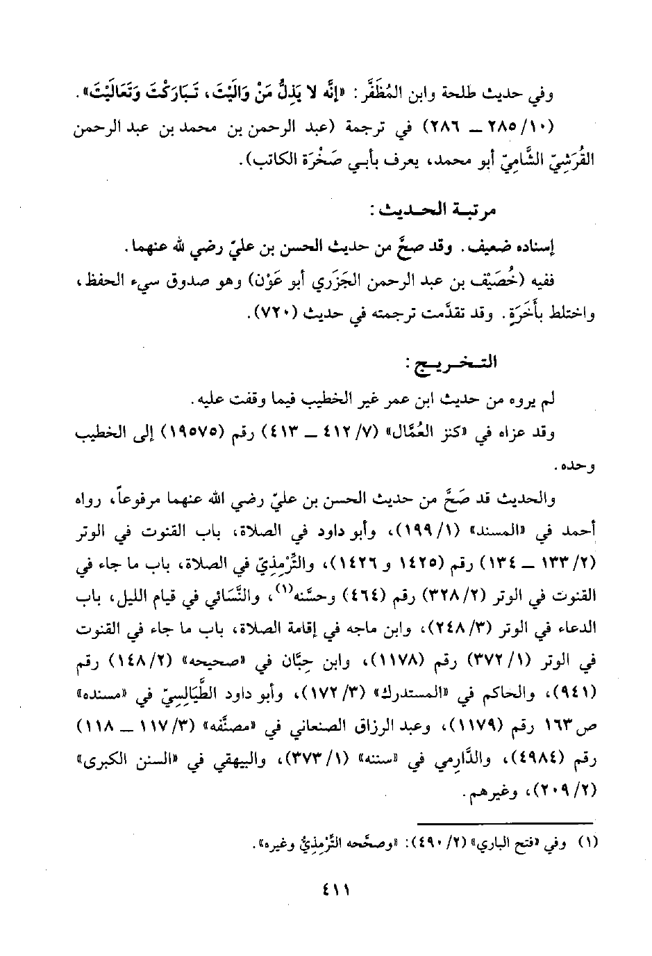 والحديث قد صَحَّ من حديث الحسن بن عليّ رضي اللَّه عنهما مرفوعًا، رواه أحمد في "المسند" (١/ ١٩٩)، وأبو داود في الصَّلاة، باب القنوت في الوتر (٢/ ١٣٣ - ١٣٤) رقم (١٤٢٥ و ١٤٢٦)، والتِّرْمِذِيّ في الصَّلاة، باب ما جاء في القنوت في الوتر (٢/ ٣٢٨) رقم (٤٦٤) وحسَّنه (¬١)، والنَّسَائي في قيام الليل، باب الدعاء في الوتر (٣/ ٢٤٨)، وابن ماجه في إقامة الصَّلاة، باب ما جاء في القنوت في الوتر (١/ ٣٧٢) رقم (١١٧٨)، وابن حِبَّان في "صحيحه" (٢/ ١٤٨) رقم (٩٤١)، والحاكم في "المستدرك" (٣/ ١٧٢)، وأبو داود الطَّيَالِسِيّ في "مسنده" ص ١٦٣ رقم (١١٧٩)، وعبد الرزاق الصنعاني في "مصنَّفه" (٣/ ١١٧ - ١١٨) رقم (١٩٨٤)، والدَّارِمي في "سننه" (١/ ٣٧٣)، والبيهقي في "السنن الكبرى" (٢/ ٢٠٩)، وغيرهم.