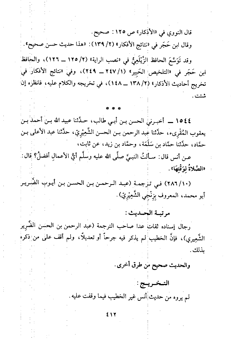 ١٥٤٤ - أخبرني الحسن بن أبي طالب، حدَّثنا عبيد اللَّه بن أحمد بن يعقوب المُقْرِئ، حدَّثنا عبد الرحمن بن الحسن الشَّعِيْريّ، حدَّثنا عبد الأعلى بن حمَّاد، حدَّثنا حمَّاد بن سَلَمَة، وحمَّاد بن زيد، عن ثابت،