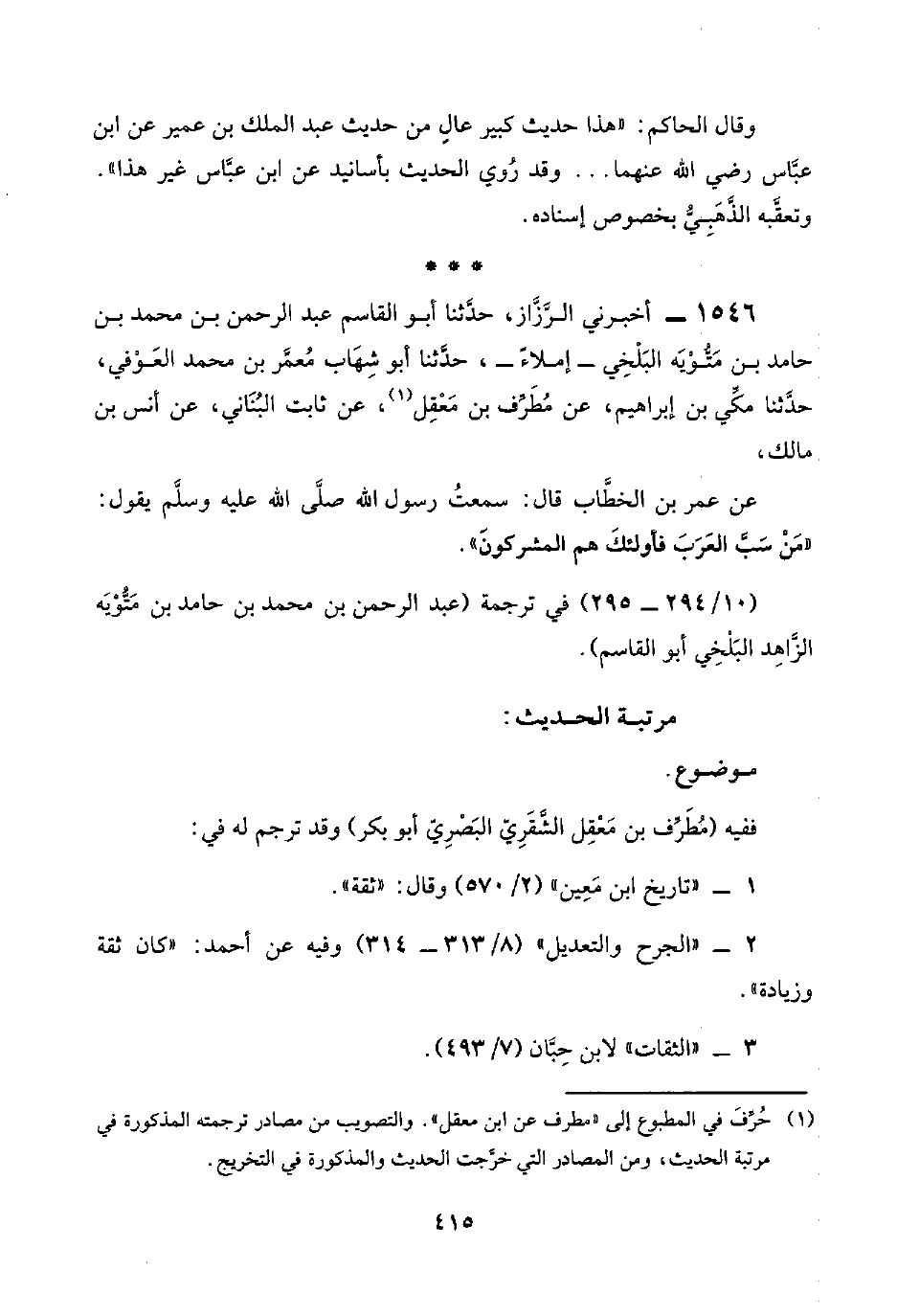 ١٥٤٦ - أخبرني الرَّزَّاز، حدَّثنا أبو القاسم عبد الرحمن بن محمد بن حامد بن مَتُّوْيَه البَلْخِي -إملاءً-، حدَّثنا أبو شهاب مُعمَّر بن محمد العَوْفي، حدَّثنا مكِّي بن إبراهيم، عن مُطَرِّف بن مَعْقِل (¬١)، عن ثابت البُنَاني، عن أنس بن مالك،